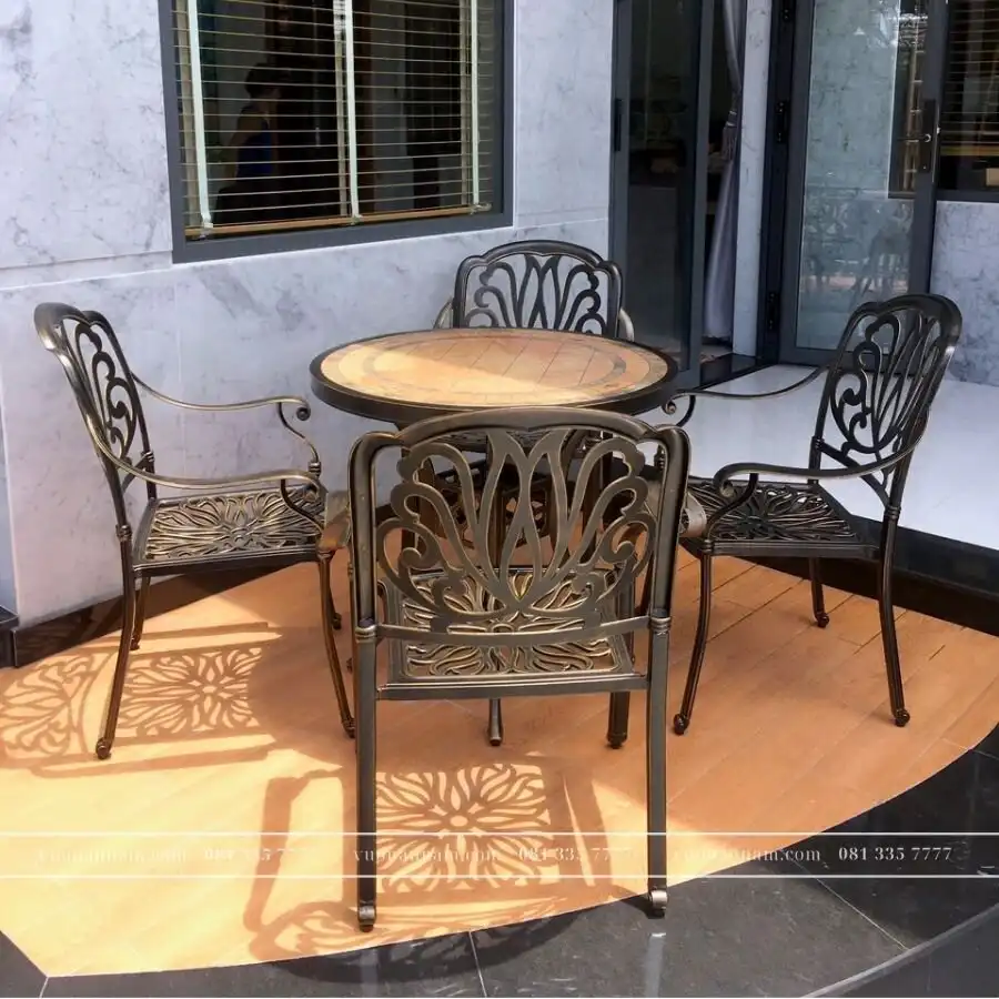 Bộ bàn ghế sân vườn được làm từ những chất liệu cao cấp nhất của ngành ngoại thất. Toàn bộ ghế và khung bàn được làm từ chất liệu nhôm đúc cao cấp. Chất liệu nhôm đúc chống oxi hóa, chống mưa nắng, không bị bong tróc, phai màu sau thời gian dài sử dụng.