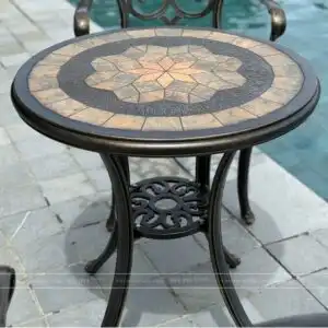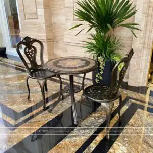 Chiếc ghế được đúc theo hình hoa văn nổi uyển chuyển, mặt ngồi lõm nhẹ tạo cảm giác cho người sử dụng. Bàn mặt đá nổi bật với nghệ thuật mosaic mới lạ giúp sản phẩm thêm sang trọng.