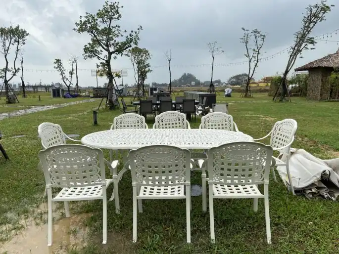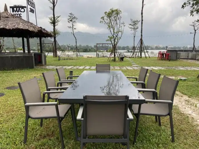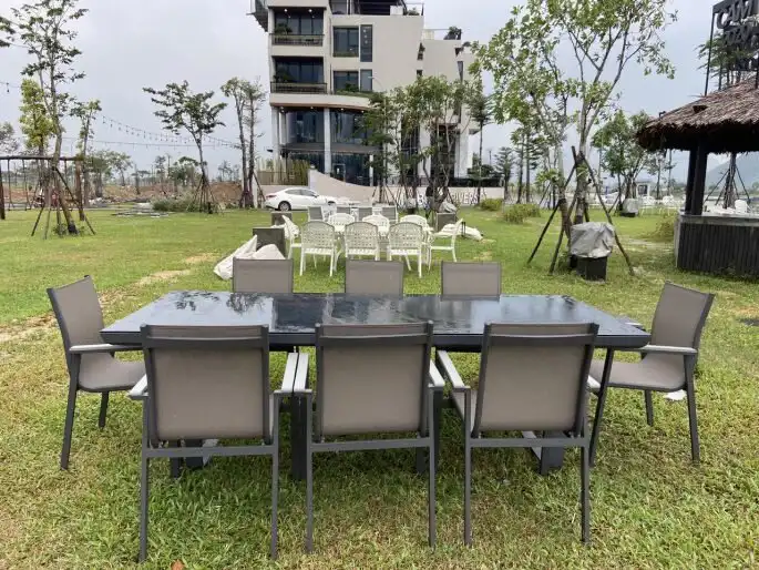 Không gian này được thiết kế thoáng mát, kết hợp với bãi cỏ xanh mát để tạo sư thư giãn cho mọi người. Bộ bàn ghế được làm từ những chất liệu cao cấp như nhôm đúc, textilene,… Đây đều là những chất liệu dành riêng cho không gian ngoài trời. Sản phẩm mang độ bền vượt trội có thể sử dụng lên đến 10 năm.