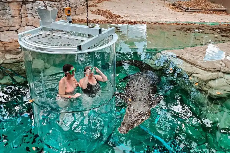 Bơi cùng với cá heo hay thậm chí cá mập cũng không thể so sánh với cảm giác đứng tim khi ở trong chiếc lồng gần với cá sấu tại bể bơi Crocosaurus Cove ở thành phố Darwin, Australia. Bạn có thể chụp hình với cá sấu con và mặt đối mặt với cá sấu mẹ khi được thả xuống bể bơi trong chiếc lồng bảo vệ. Crocosaurus Cove có sức chứa 52.834 gallon nước ngọt.
