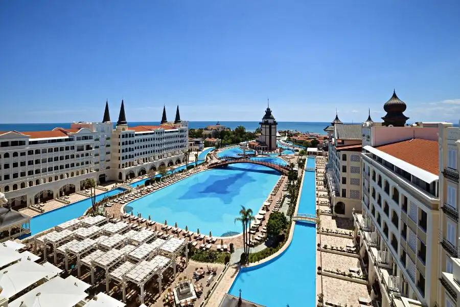 Bể bơi với làn nước xanh như ngọc này được đặt ở trung tâm khách sạn Mardan Palace ở Antalya, thành phố bên bờ Tây Nam Thổ Nhĩ Kỳ, bên bờ Địa Trung Hải. Bể bơi được thiết kế bao quanh một tháp cao rất ấn tượng, xung quanh thành bể được rọi chiếu với hệ thống đèn LED lấp lánh.