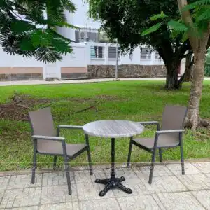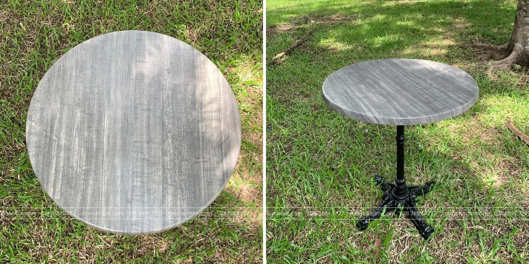 Mặt bàn làm từ mặt gỗ phủ lớp nhựa Resin là chất liệu cao cấp sử dụng cho không gian ngoài trời. Ngoài ra, bàn có khả năng chịu được mọi điều kiện của thời tiết khắc nghiệt, không để xảy ra tình trạng rỉ sét, bong tróc trong suốt quá trình sử dụng.