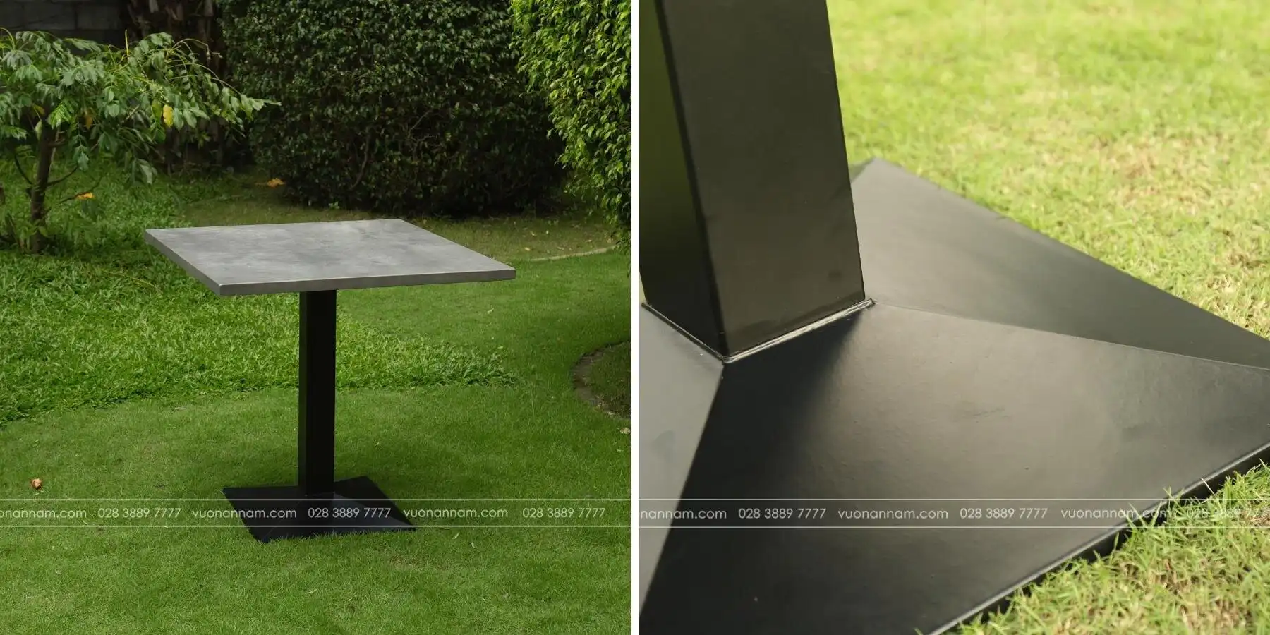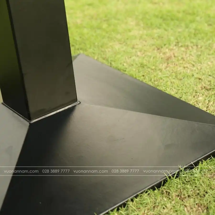 Chân thép có độ cứng cao, chịu lực tốt, được sơn nước sơn tĩnh điện màu đen. Nhờ đó, chân gang đảm bảo chịu lực, chịu mưa nắng mà vẫn bền màu, tươi mới. Thiết kế cứng cáp và tinh giản