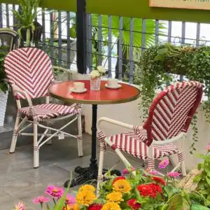 Bộ bàn ghế ban công BC-05 không chỉ là nơi thư giãn, mà còn là điểm nhấn giúp không gian trở nên sinh động và đầy sức sống. Khi đặt ngoài trời, ánh nắng chiếu nhẹ qua giàn cây, sắc đỏ của bàn ghế hòa cùng sắc hoa rực rỡ, mang đến cảm giác như một góc quán châu Âu ngay trong nhà bạn.