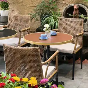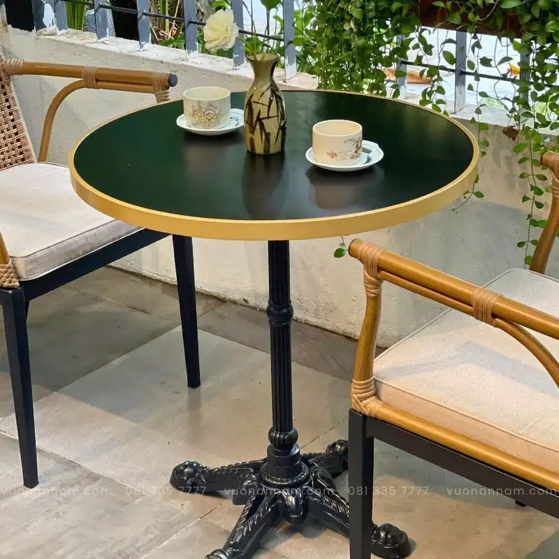 - Chất liệu bàn: Chân gang đúc, mặt bàn nhôm sơn tĩnh điện, viền bàn nhôm sơn mạ vàng.