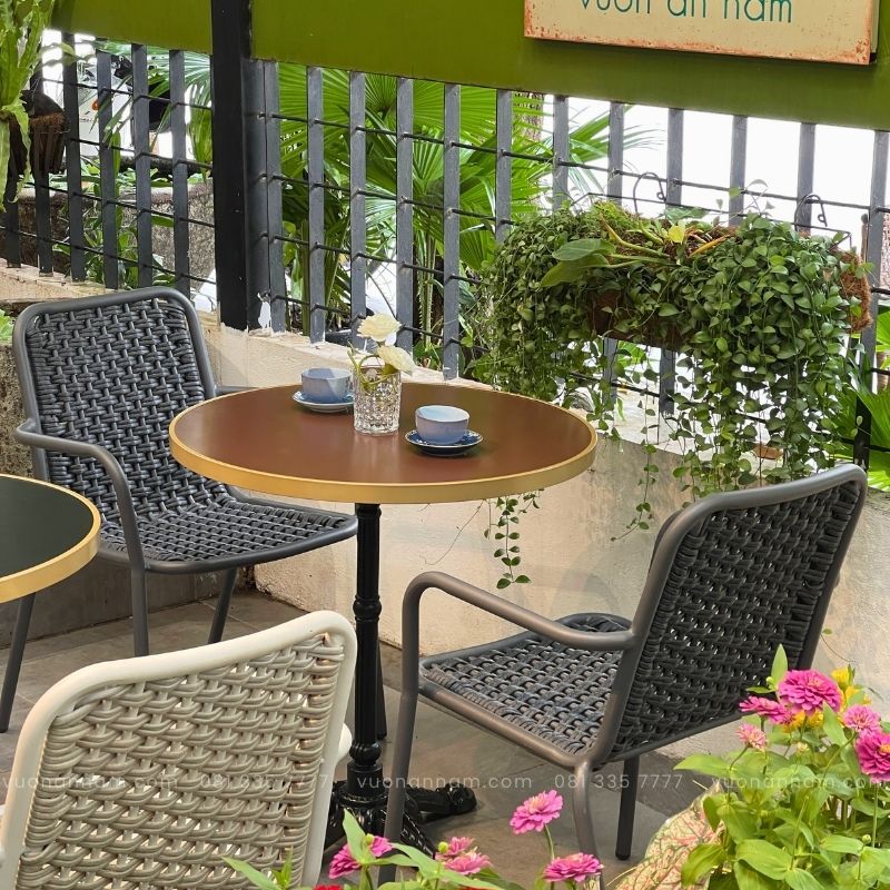 • Chất liệu bàn: Chân gang đúc, mặt bàn nhôm sơn tĩnh điện, viền bàn nhôm sơn mạ vàng.