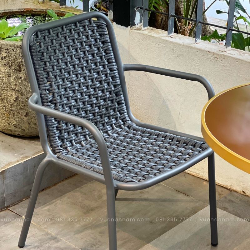 • Chất liệu ghế: Khung nhôm sơn tĩnh điện, mặt ngồi và lưng tựa đan Plastic rope