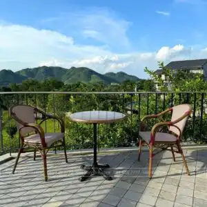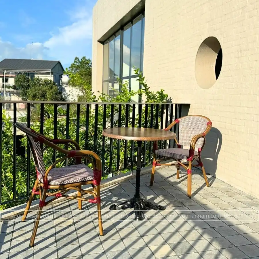 Chân bàn được làm từ nhôm đúc sơn tĩnh điện, mang lại độ ổn định và độ bền cao. Chất liệu nhôm cũng đảm bảo khả năng chống ăn mòn và oxi hóa, giúp bàn duy trì vẻ đẹp trong thời gian dài. Bề mặt bàn được phủ lớp Resin chống thấm nước, chống trầy xước và dễ dàng vệ sinh. Với vẻ đẹp tự nhiên và sự bền bỉ, bàn mang đến một không gian ấm cúng và thư giãn cho ban công của bạn.