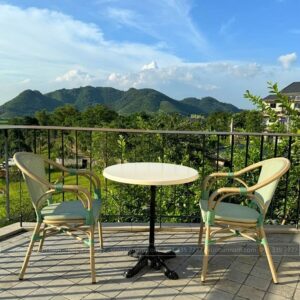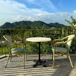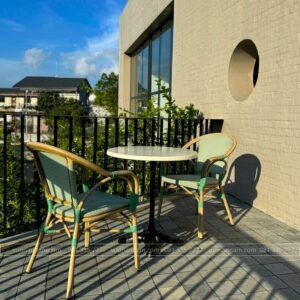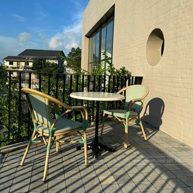 Sản phẩm này có thiết kế hiện đại và tinh tế, tạo điểm nhấn độc đáo cho không gian ban công. Đường nét mềm mại và tỉ mỉ từ khung ghế đến bàn mặt tạo nên một không gian ngoài trời thú vị và ấn tượng. Sản phẩm có kích thước phù hợp cho không gian ban công nhỏ, căn hộ hay quán cà phê. Sản phẩm dễ dàng di chuyển và lắp đặt, cho phép bạn tùy chỉnh vị trí và sắp xếp theo ý thích và nhu cầu của bạn.