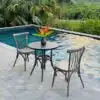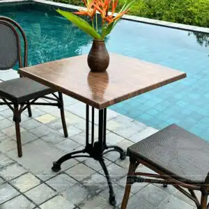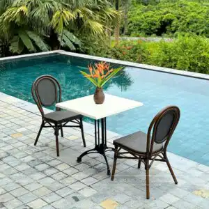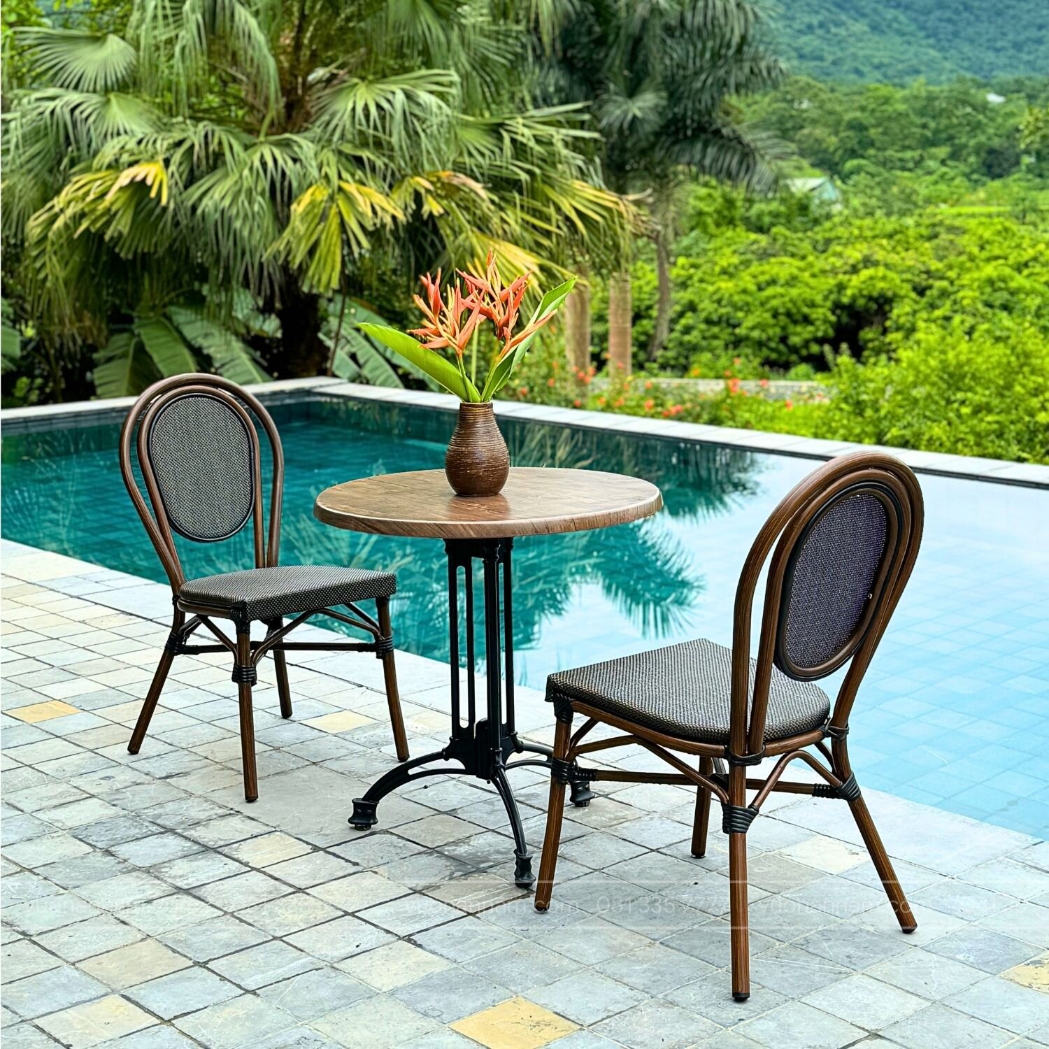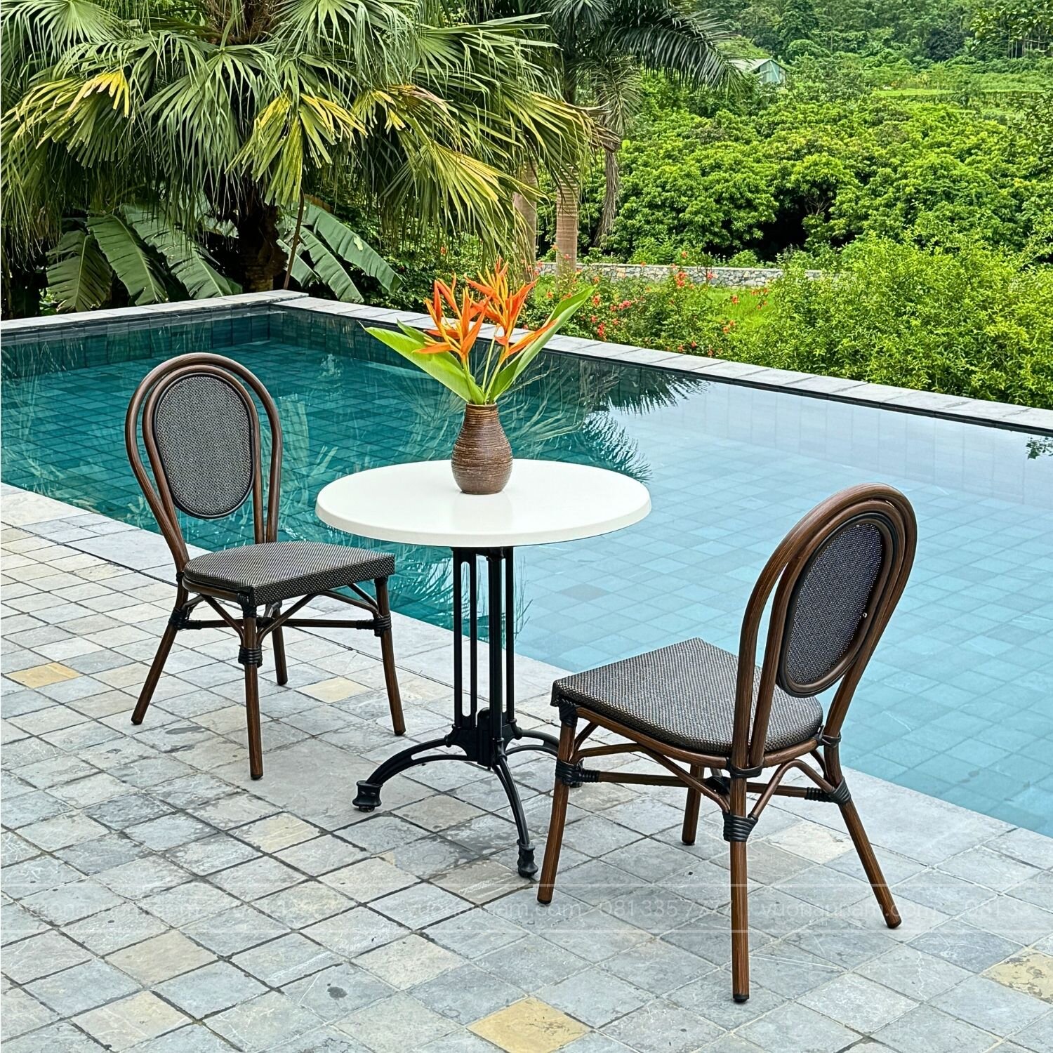 Chất liệu bàn được làm từ chân nhôm đúc sơn tĩnh điện, mang lại độ bền và khả năng chống oxy hóa. Bàn mặt được phủ Resin, tạo thành một bề mặt mịn màng và bền bỉ, đồng thời dễ dàng làm sạch và chống mài mòn từ các yếu tố môi trường.