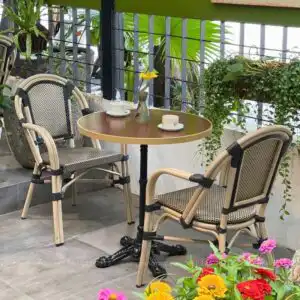- Chất liệu bàn: Chân gang đúc, mặt bàn nhôm sơn tĩnh điện, viền bàn nhôm sơn mạ vàng.