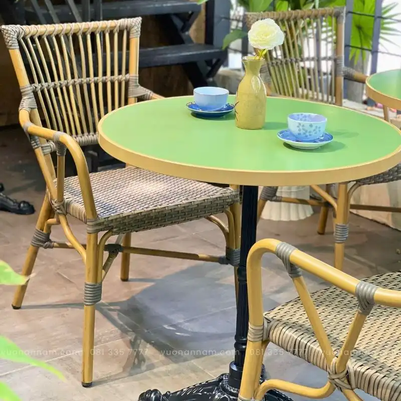 - Chất liệu bàn: Chân gang đúc, mặt bàn nhôm sơn tĩnh điện, viền bàn nhôm sơn mạ vàng.