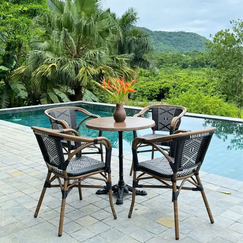 Ghế của bộ này được làm từ khung nhôm sơn tĩnh điện, mang lại độ bền vượt trội và khả năng chống oxy hóa. Mặt ngồi và lưng tựa được đan từ nhựa giả mây, tạo ra vẻ đẹp tự nhiên và sang trọng. Chất liệu này cũng khá nhẹ, giúp dễ dàng di chuyển ghế khi cần thiết. Bàn có chân nhôm đúc sơn tĩnh điện, mang lại tính ổn định và độ bền cao. Mặt bàn được làm từ gỗ phủ Resin, tạo ra một bề mặt mịn màng, chống trầy xước và chống thấm nước. Đồng thời, lớp phủ Resin cũng giúp bàn dễ dàng lau chùi và bảo quản.