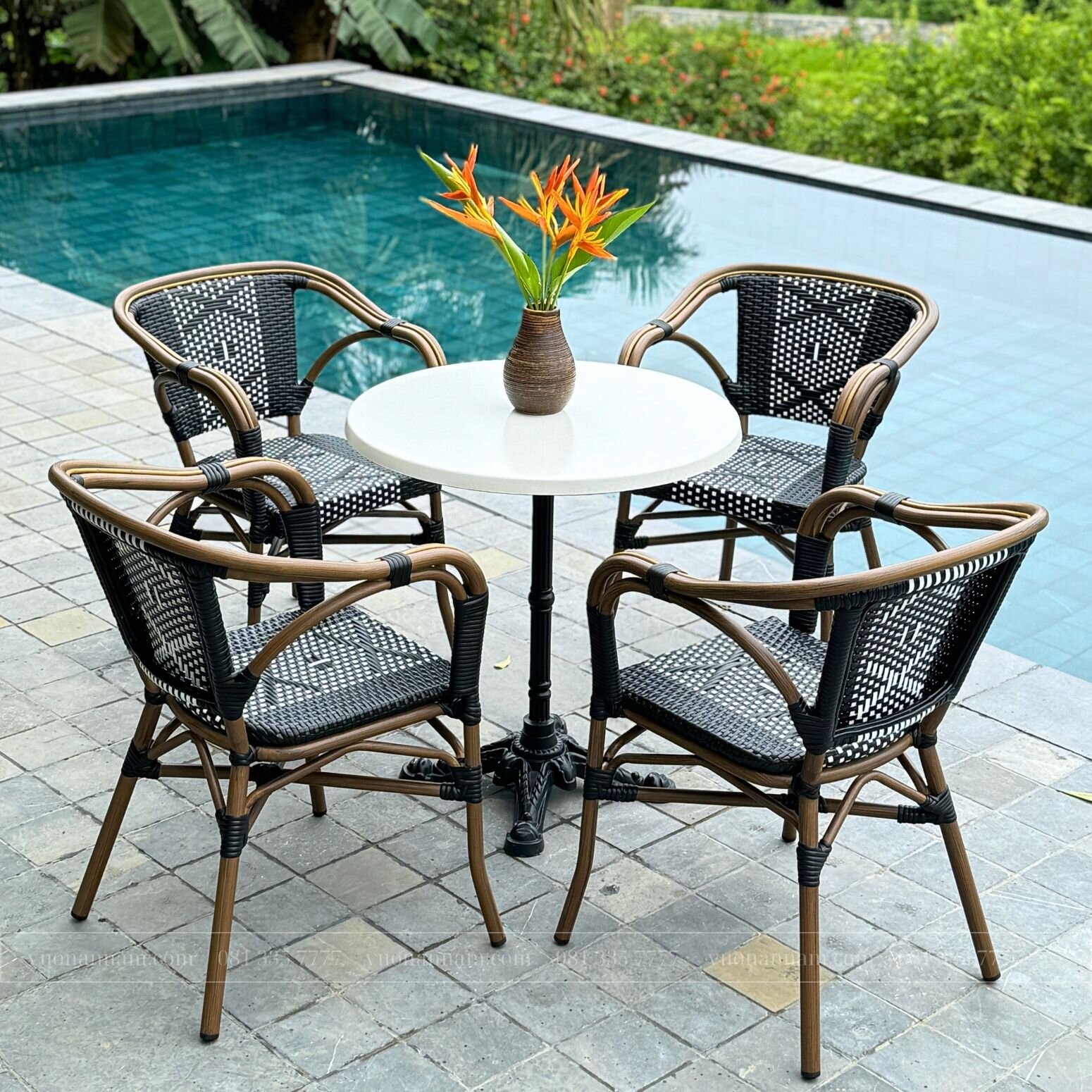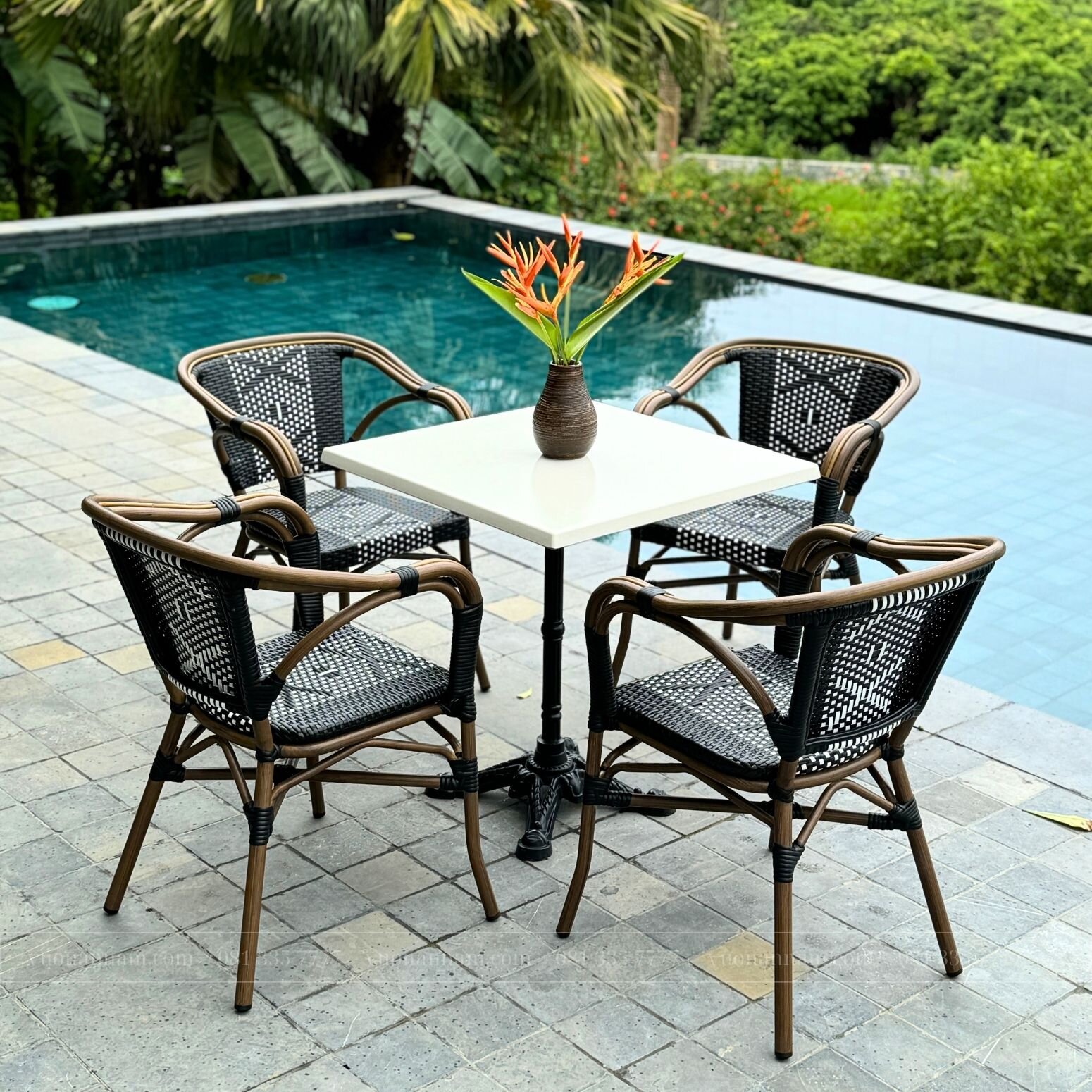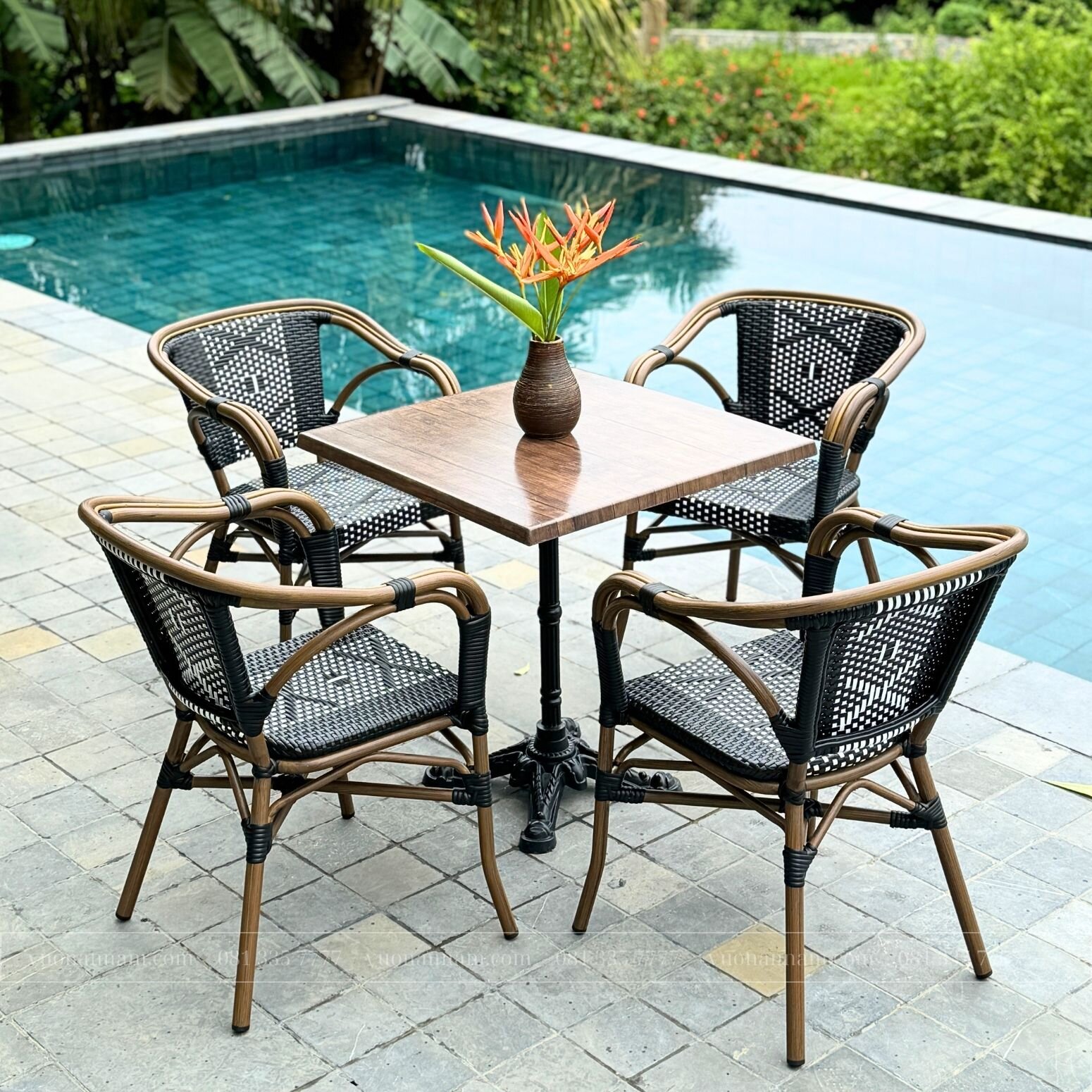 Ghế của bộ này được làm từ khung nhôm sơn tĩnh điện, mang lại độ bền vượt trội và khả năng chống oxy hóa. Mặt ngồi và lưng tựa được đan từ nhựa giả mây, tạo ra vẻ đẹp tự nhiên và sang trọng. Chất liệu này cũng khá nhẹ, giúp dễ dàng di chuyển ghế khi cần thiết. Bàn có chân nhôm đúc sơn tĩnh điện, mang lại tính ổn định và độ bền cao. Mặt bàn được làm từ gỗ phủ Resin, tạo ra một bề mặt mịn màng, chống trầy xước và chống thấm nước. Đồng thời, lớp phủ Resin cũng giúp bàn dễ dàng lau chùi và bảo quản.