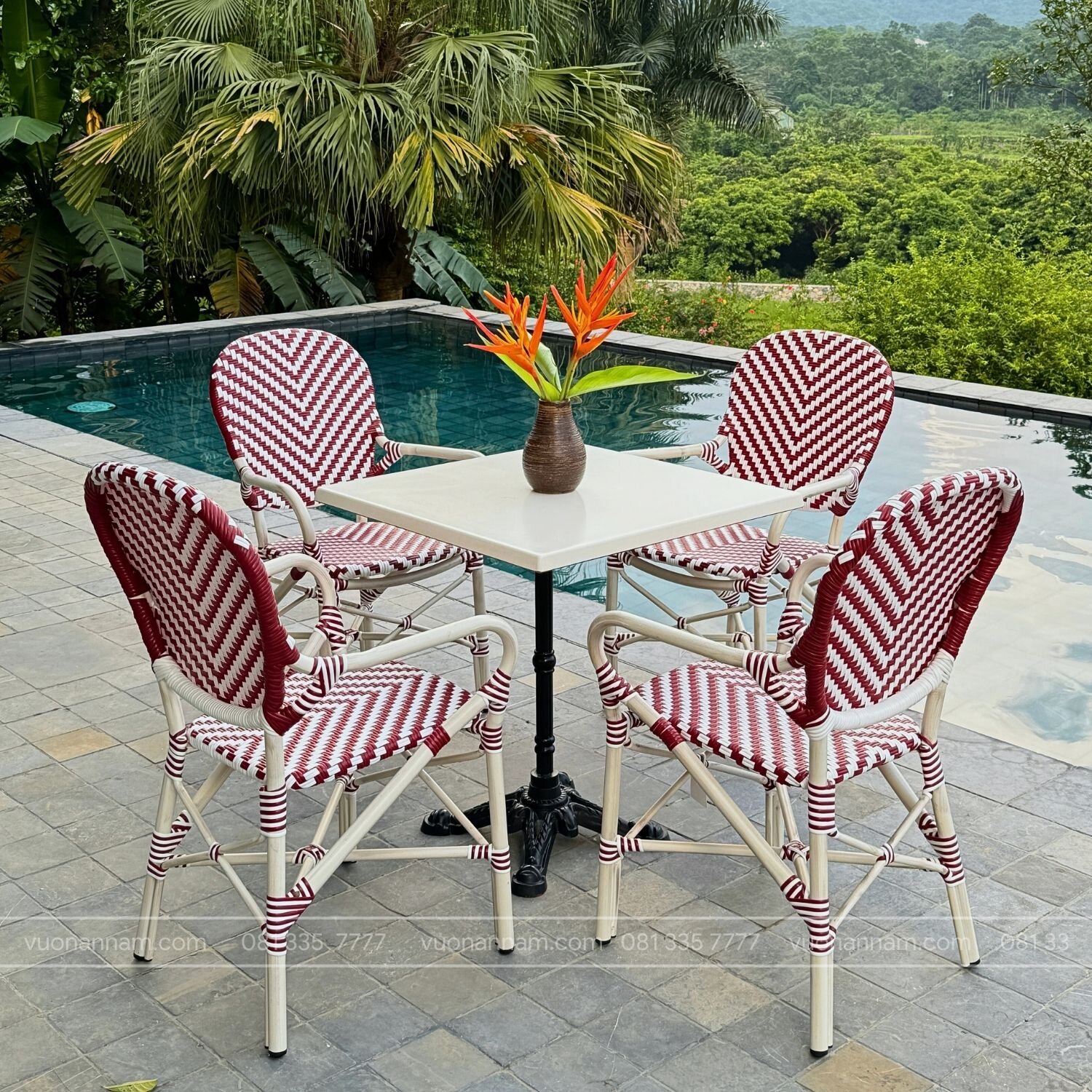 - Chất liệu ghế: Khung nhôm sơn tĩnh điện, mặt ngồi và lưng tựa đan nhựa giả mây