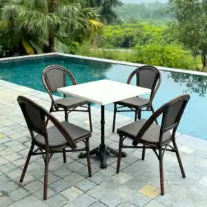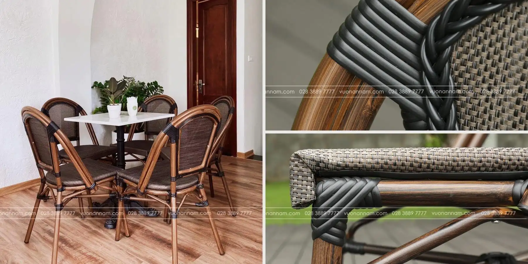 Mặt bàn được làm từ nhựa composite phủ resin giúp chịu lực tốt, không bị mối mọt. Mặt ghế textilene chống thấm nước nước giúp dễ dàng vệ sinh, lau chùi. Vải textilene cấu trúc dạng lưới, có kẻ hở tạo cảm giác thoáng mát khi ngồi.