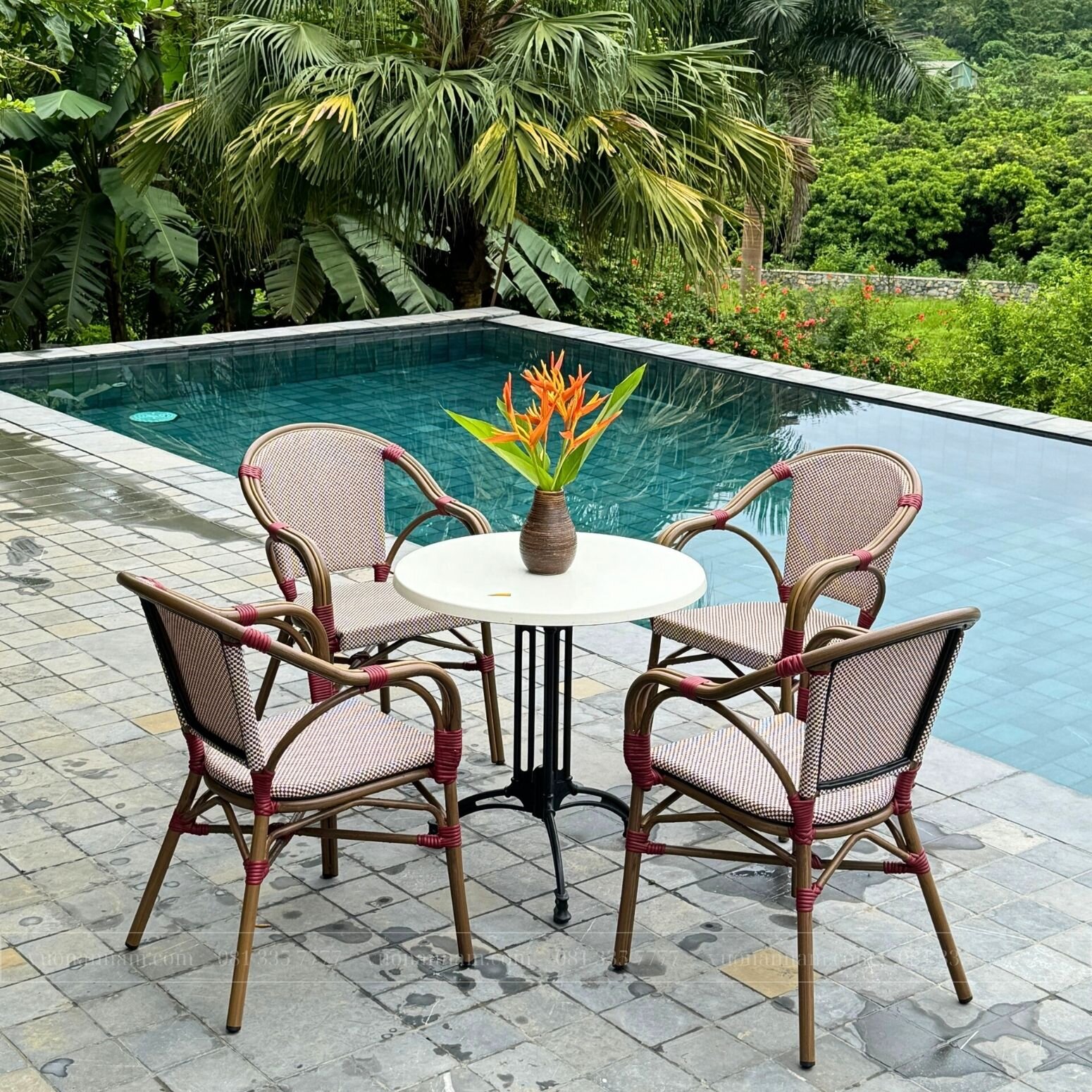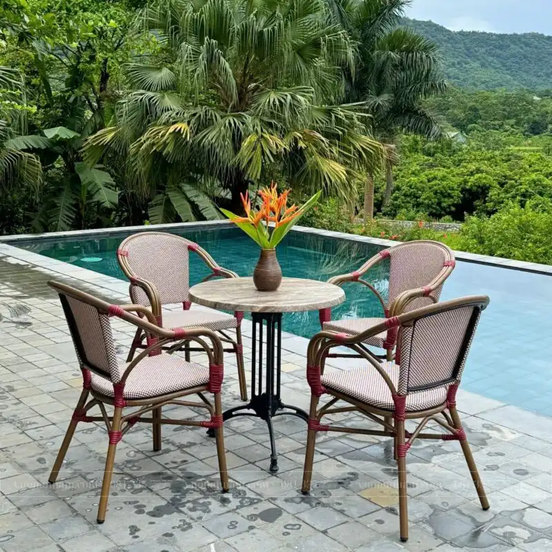 Bàn mặt gỗ phủ Resin không chỉ tạo điểm nhấn đẹp mắt mà còn có khả năng chống thấm nước và chống trầy xước. Chân nhôm đúc sơn tĩnh điện đảm bảo độ ổn định và độ bền, cho phép bộ bàn ghế đứng vững trước các yếu tố môi trường khắc nghiệt.