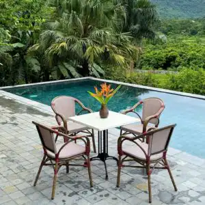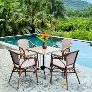 Bàn mặt gỗ phủ Resin không chỉ tạo điểm nhấn đẹp mắt mà còn có khả năng chống thấm nước và chống trầy xước. Chân nhôm đúc sơn tĩnh điện đảm bảo độ ổn định và độ bền, cho phép bộ bàn ghế đứng vững trước các yếu tố môi trường khắc nghiệt.