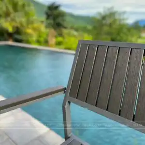 Khung hợp kim nhôm vốn chống oxi hóa, được phủ thêm 2 lớp sơn tĩnh điện, giúp bàn ghế đặt ngoài trời nhiều năm vẫn không bay màu. Polywood là vật liệu tổng hợp, thay thế gỗ trong môi trường ngoài trời. Nan polywood (hay composite) có đặc tính không phai màu, không cong vênh, không mối mọt.