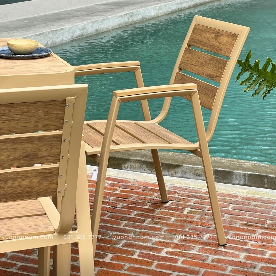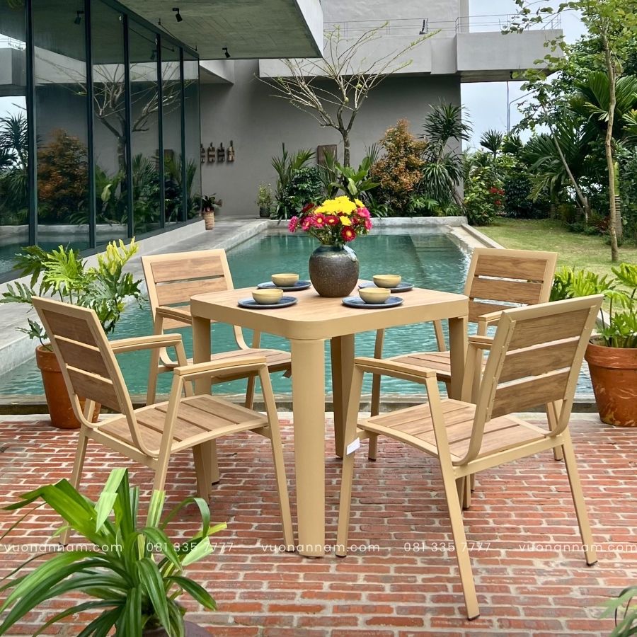 Bộ bàn ghế mang thiết kế từ những đường nét dứt khoát, kiểu dáng tối giản đến từng chi tiết. Đó là sự kết hợp hài hòa giữa tone màu Beige nhẹ nhàng cùng tone màu gỗ nổi bật không gian sân vườn. Dù mang thiết kế tối giản nhưng bộ bàn ghế vẫn nổi bật khi đặt tại mọi không gian.
