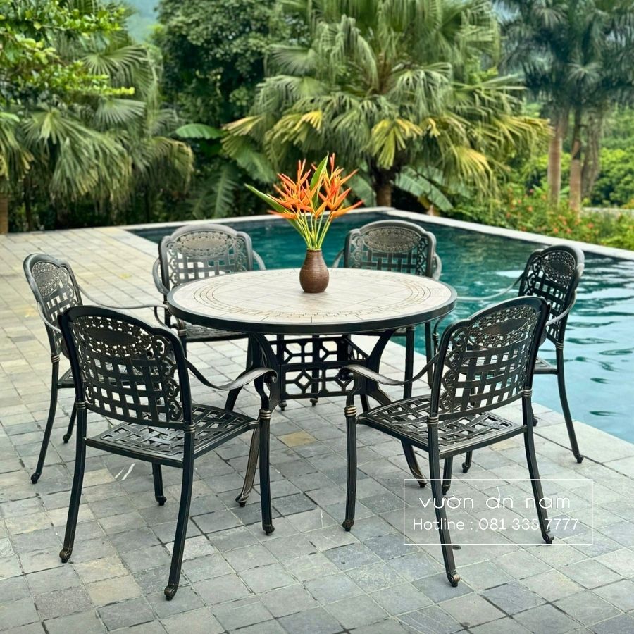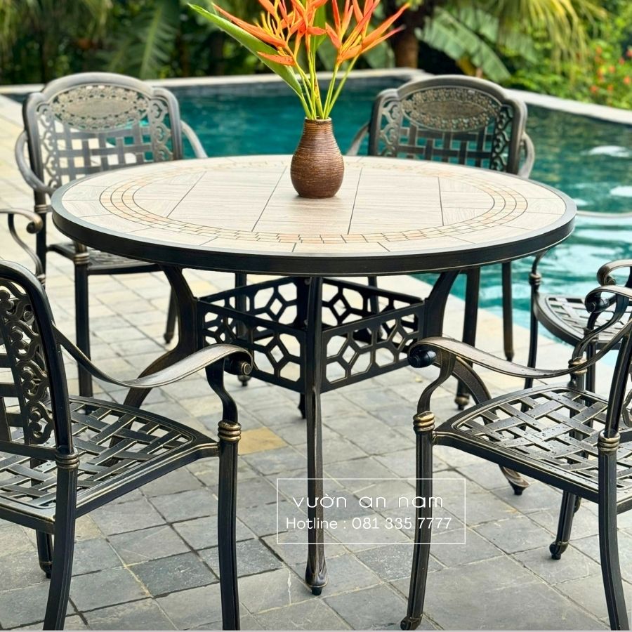 Bộ bàn ghế sân vườn cao cấp được hoàn thiện từ chất liệu nhôm đúc cao cấp dành cho không gian ngoài trời. Ngoài ra, nhôm đúc có đặc tính nổi bật là nhẹ mà bền, dễ dàng di chuyển ở mọi không gian.