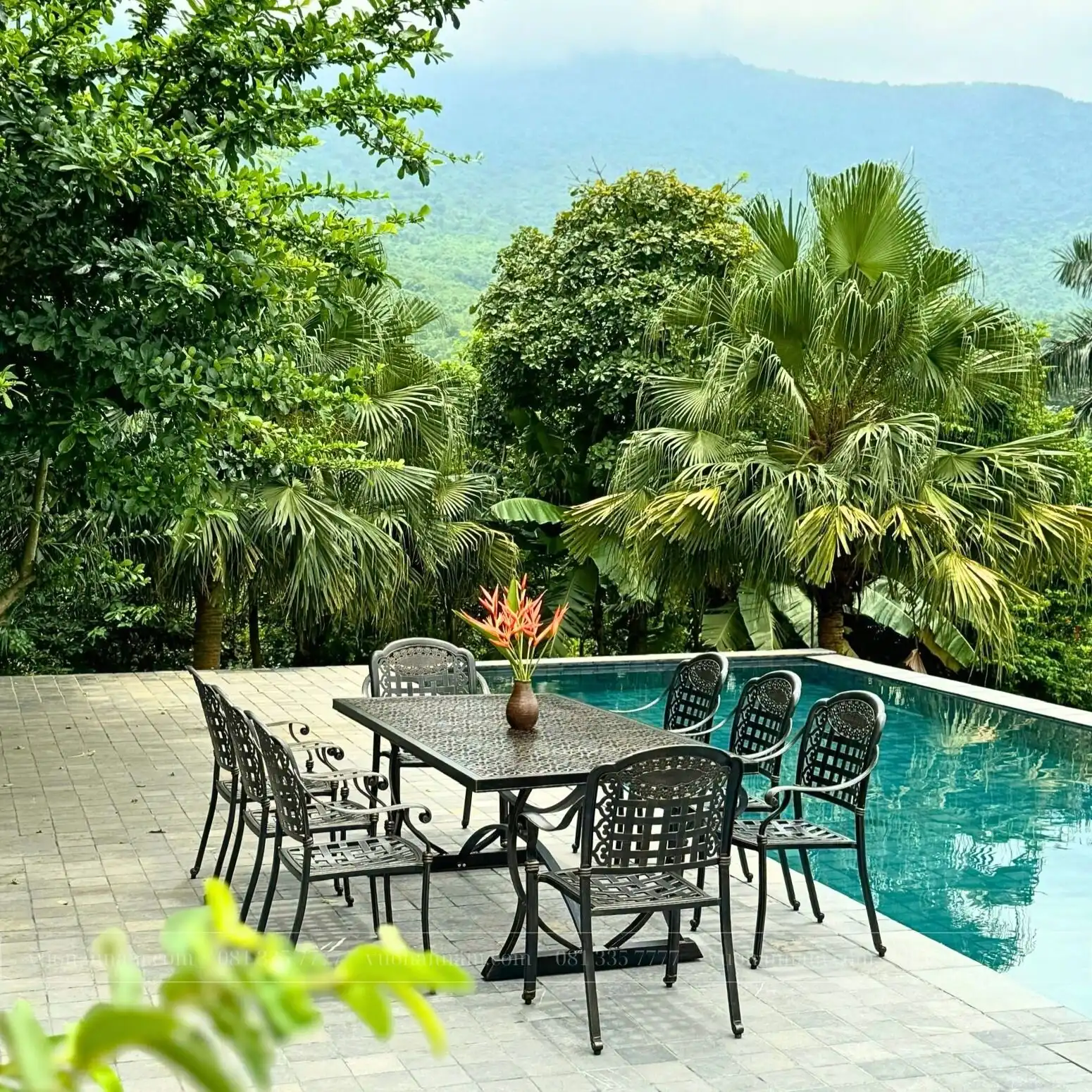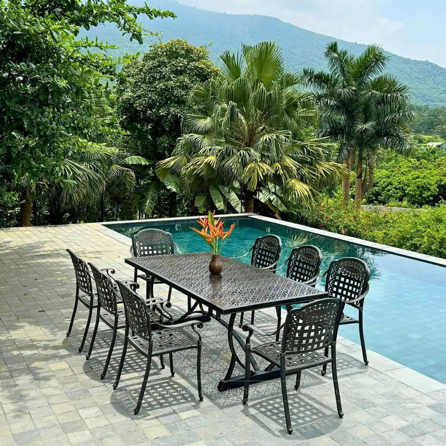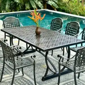 Bàn chữ nhật có kích thước lên đến 2 mét tạo sự tiện nghi, thoải mái, thích hợp cho những bữa tiệc sân vườn. Mặt bàn ghi điểm bởi những hoa văn đúc hở đối xứng, uốn cong một cách mềm mại.