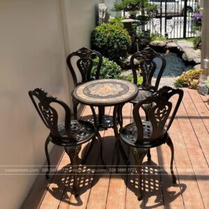 Bộ bàn ghế nhôm đúc sân vườn mang thiết kế sang trọng phù hợp với nhiều không gian sân vườn khác nhau. Đó có thể là không gian ban công mát mẻ, cũng có thể là không gian sân vườn thoáng đãng. Bộ bàn ghế sẽ là điểm nhấn hoàn hảo giúp không gian thêm nổi bật. Với kích thước không quá to, đây sẽ là dừng chân để thưởng trà, thư giãn hay đọc sách, nhâm nhi tách cafe vào buổi sáng.