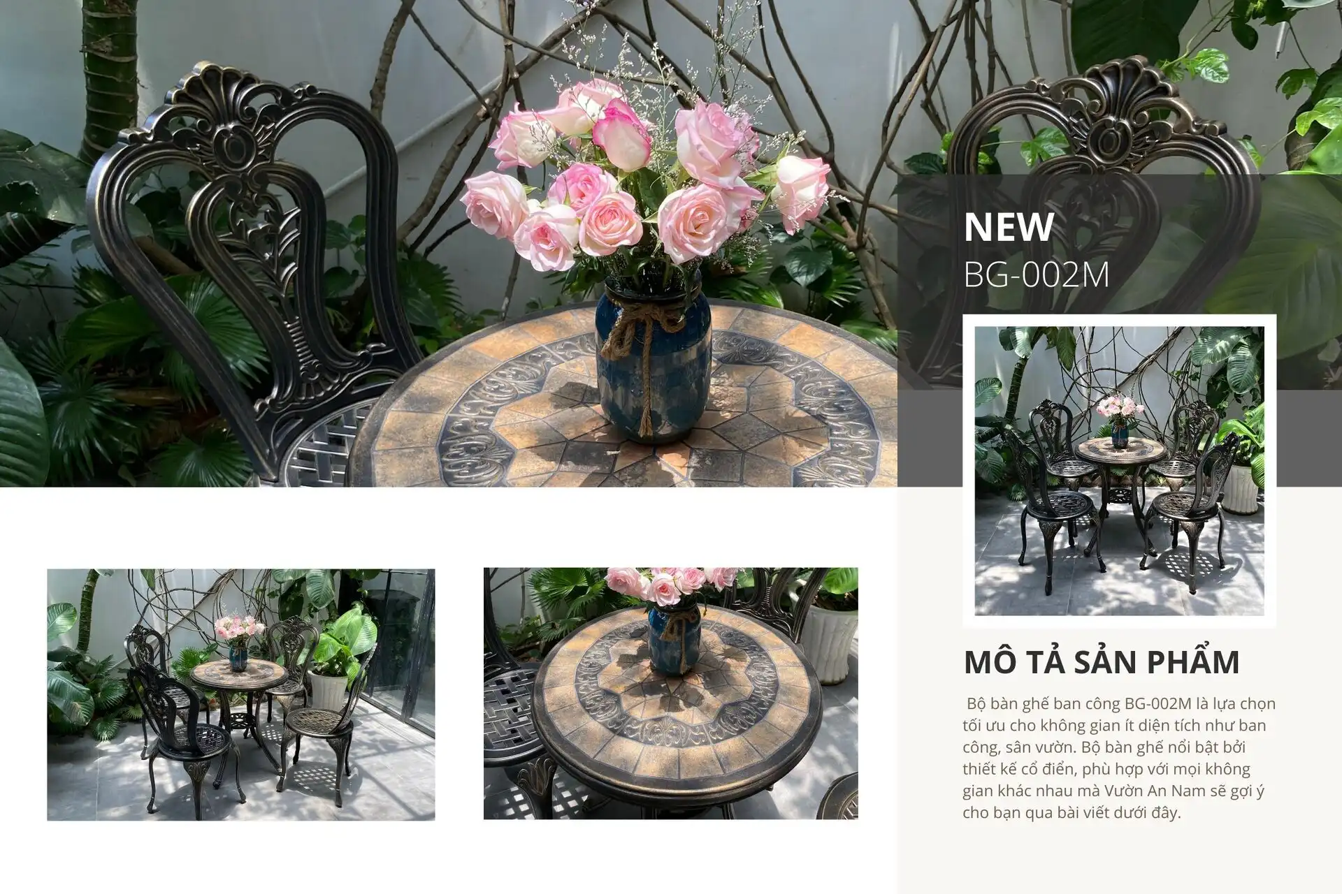 Nếu bạn đang lựa chọn bộ bàn ghế nhôm đúc cho không gian sân vườn đạt đủ mọi công năng. Sản phẩm vừa đáp ứng nhu cầu thẩm mỹ, vừa là nơi thư giãn của gia đình thì bộ bàn ghế BG-002M sẽ là gợi ý hoàn hảo dành cho bạn.