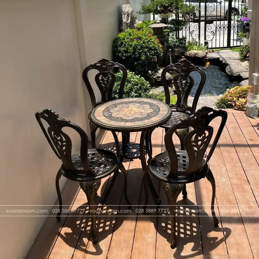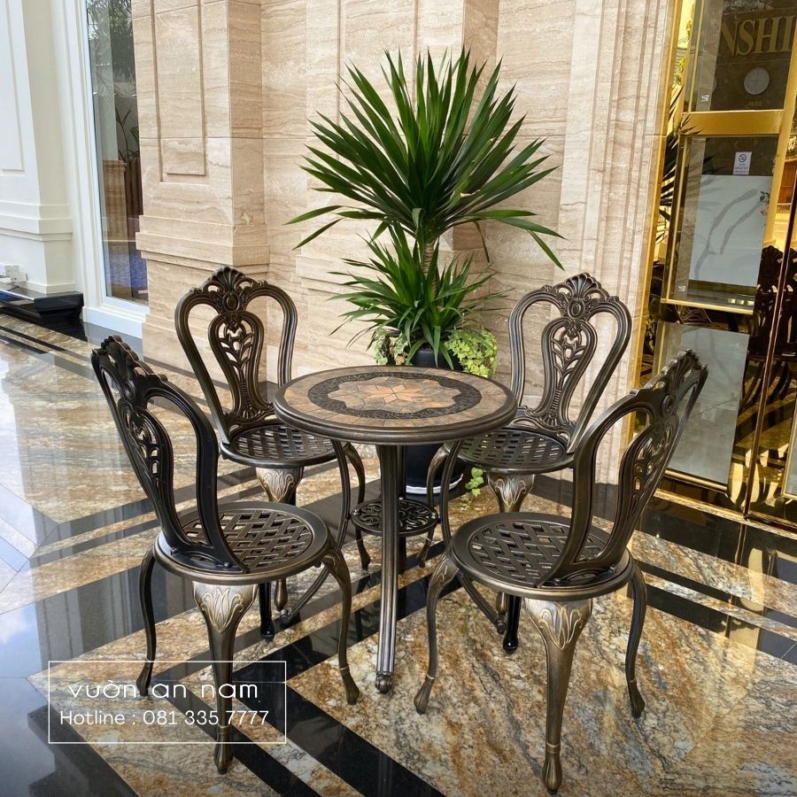 Bộ bàn ghế nhôm đúc sân vườn mang thiết kế sang trọng phù hợp với nhiều không gian sân vườn khác nhau. Đó có thể là không gian ban công mát mẻ, cũng có thể là không gian sân vườn thoáng đãng. Bộ bàn ghế sẽ là điểm nhấn hoàn hảo giúp không gian thêm nổi bật. Với kích thước không quá to, đây sẽ là dừng chân để thưởng trà, thư giãn hay đọc sách, nhâm nhi tách cafe vào buổi sáng.