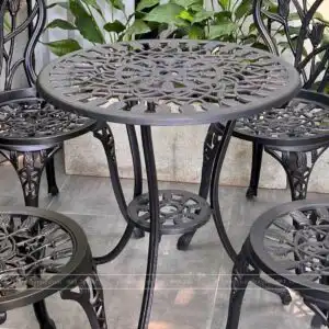 Bộ bàn ghế được chế tác từ nhôm đúc liền khối sử dụng công nghệ đúc khuôn áp lực cao, cho phép tạo ra những chi tiết sắc sảo và đồng nhất, hạn chế hoàn toàn tình trạng mối nối hay gỉ sét thường gặp ở vật liệu kim loại thông thường.