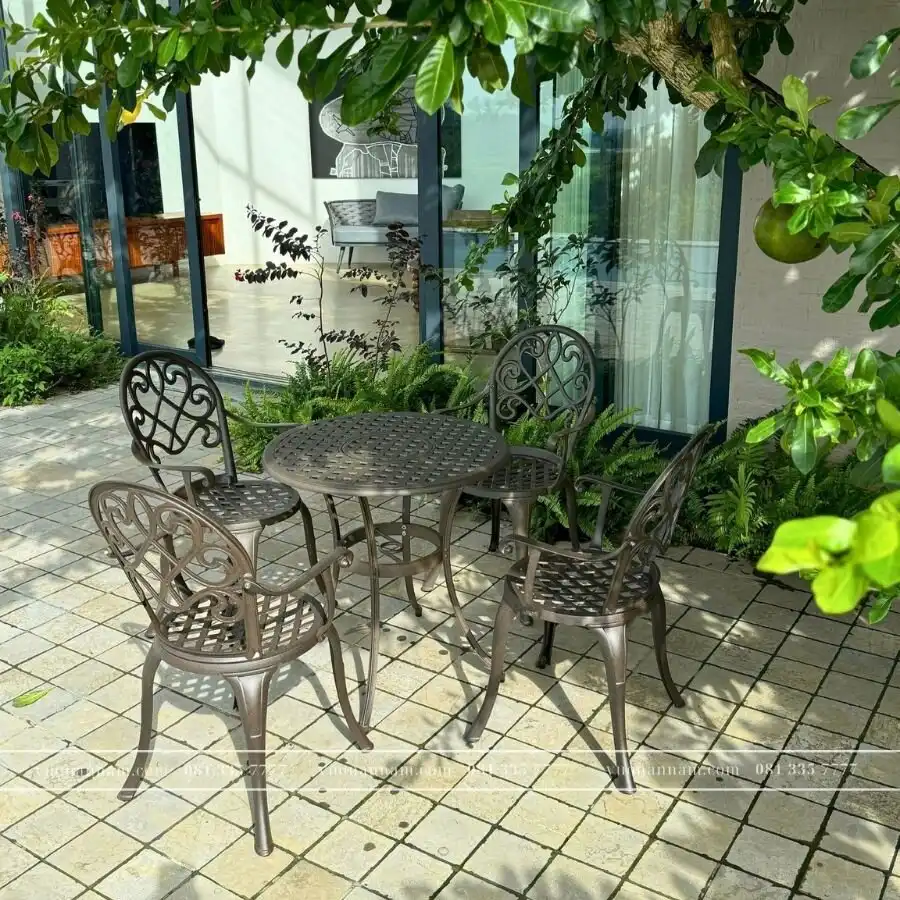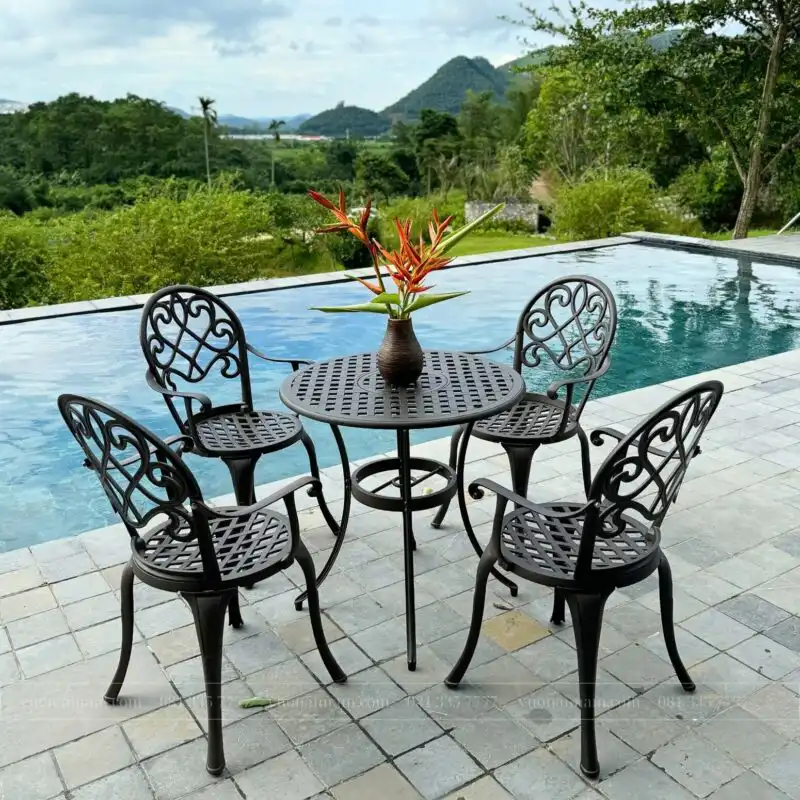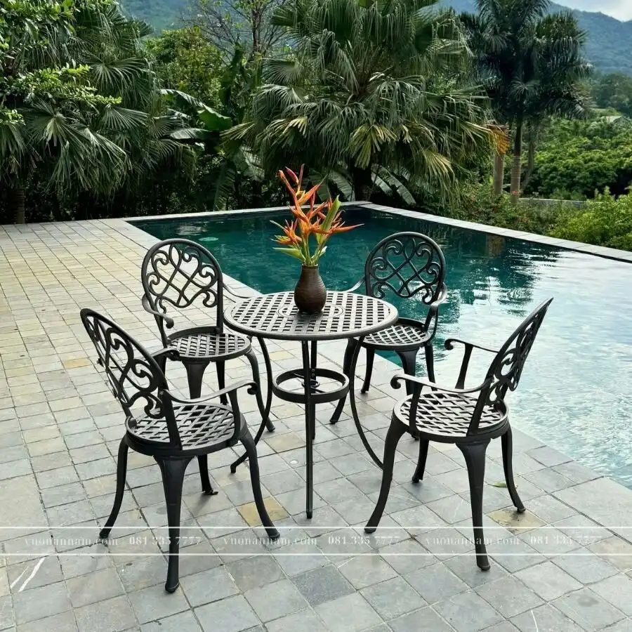 Thiết kế tinh tế với đường nét hoa văn cổ điển, bộ bàn ghế này không chỉ tạo nên điểm nhấn trang trí nổi bật mà còn mang lại trải nghiệm ngồi thoải mái, phù hợp cho nhiều không gian ngoài trời như sân vườn, ban công hay khu vực hồ bơi.