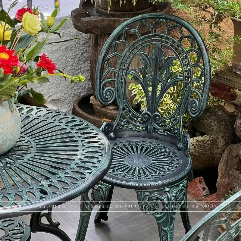 Mặt bàn tròn với hoa văn lồng ghép tinh tế không chỉ mang tính trang trí mà còn giúp mặt bàn thoát nước nhanh, khô ráo sau khi mưa, phù hợp cho khu vực sân vườn. Đặc biệt, toàn bộ sản phẩm khoác lên mình lớp sơn xanh rêu đặc trưng, sắc xanh trầm ấm mang nét cổ điển, giúp bàn ghế hòa quyện tự nhiên vào khung cảnh cây cối, đá cảnh hoặc sân vườn ngoài trời.