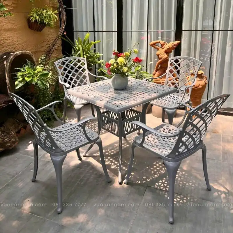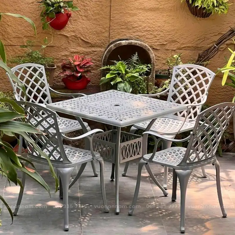 - Khả Năng Chịu Thời Tiết: Được làm từ kim loại chống gỉ, bộ bàn ghế có thể chịu được các điều kiện thời tiết khắc nghiệt như mưa, nắng gắt mà không bị hư hỏng hay xuống cấp. Điều này giúp tiết kiệm chi phí bảo trì và thay thế trong thời gian dài.