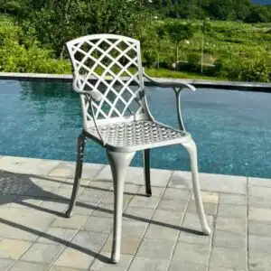 Bộ bàn ghế sân vườn này được thiết kế với kiểu dáng hiện đại nhưng vẫn giữ được nét cổ điển, tạo nên sự hài hòa và thanh lịch. Chất liệu kim loại sơn tĩnh điện không chỉ mang lại vẻ ngoài bóng bẩy, sang trọng mà còn đảm bảo độ bền bỉ và khả năng chống gỉ sét. Các họa tiết xen kẻ trên mặt bàn và lưng ghế không chỉ tạo điểm nhấn nghệ thuật mà còn làm tăng sự thoáng mát, giúp không gian trở nên nhẹ nhàng và thoải mái hơn.