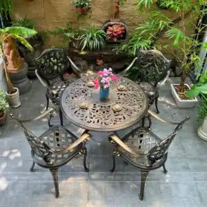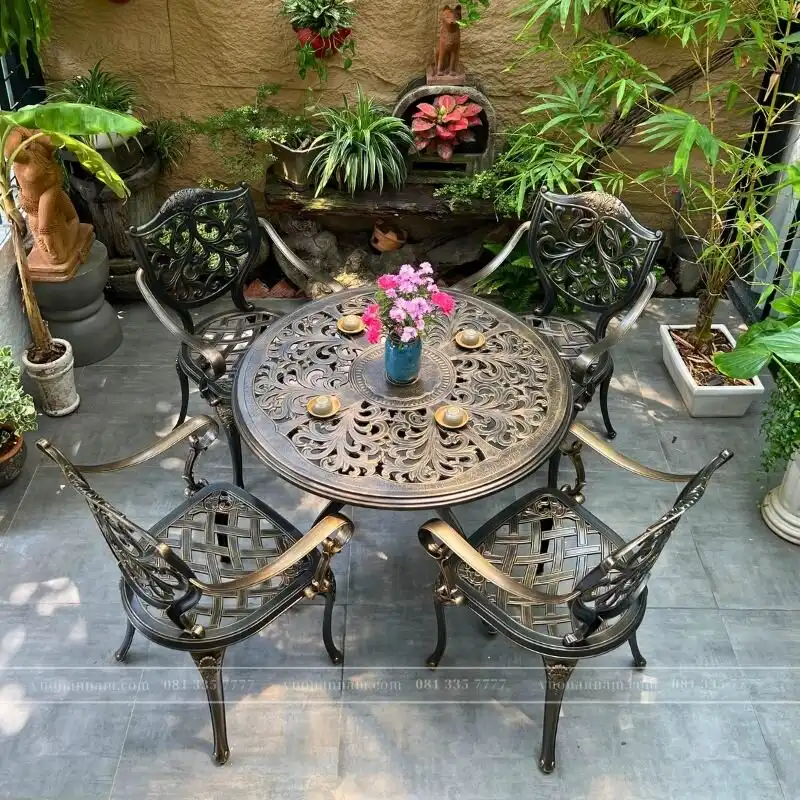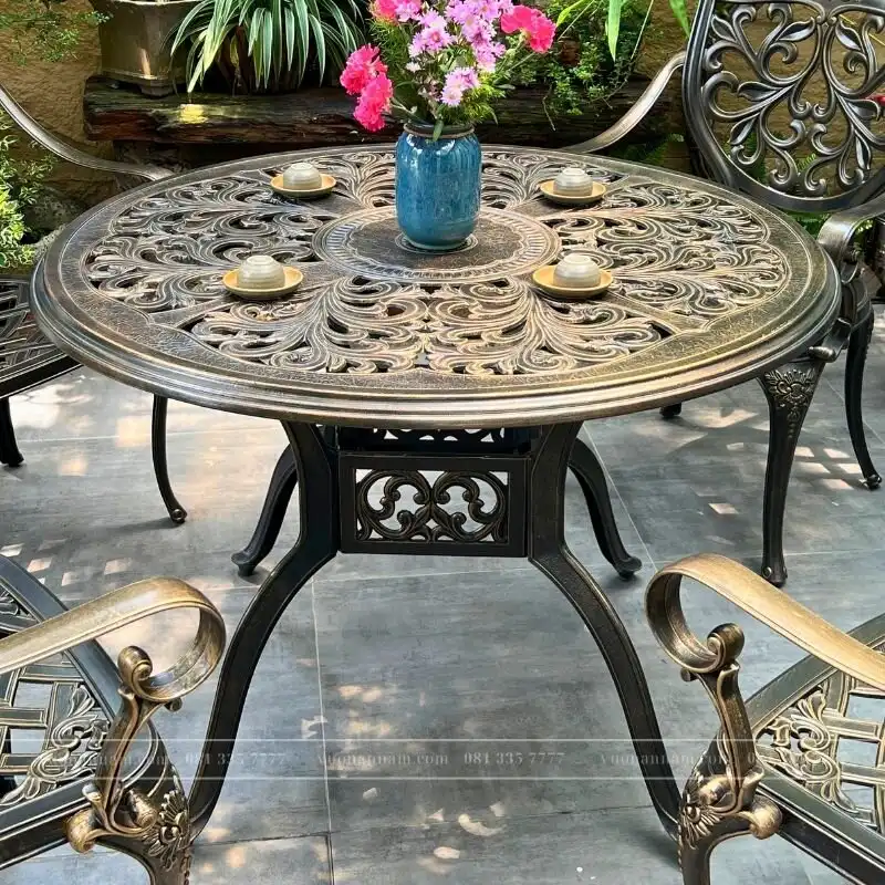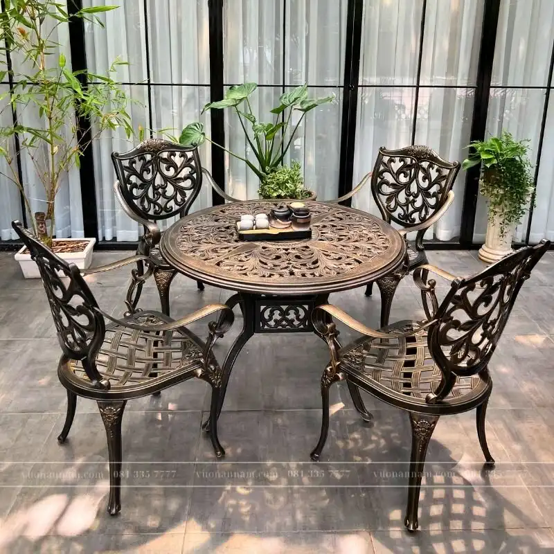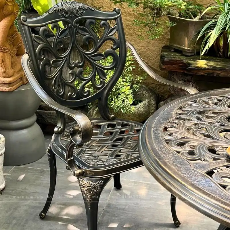 Chiếc ghế sở hữu chiều sâu cùng kích thước và những đường cong tạo cảm giác thoải mái cho người ngồi. Ngoài ra, bàn nhôm đúc gây ấn tượng bởi hoa văn in nổi lạ mắt, sang trọng, lựa chọn hoàn hảo cho không gian.