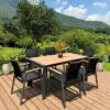 Khung hợp kim nhôm vốn chống oxi hóa, được phủ thêm 2 lớp sơn tĩnh điện, giúp bàn ghế đặt ngoài trời nhiều năm vẫn tươi màu, đẹp như lúc mới mua. Polywood là vật liệu tổng hợp, thay thế gỗ trong môi trường ngoài trời. Nan polywood (hay composite) có đặc tính không phai màu, không cong vênh, không mối mọt.