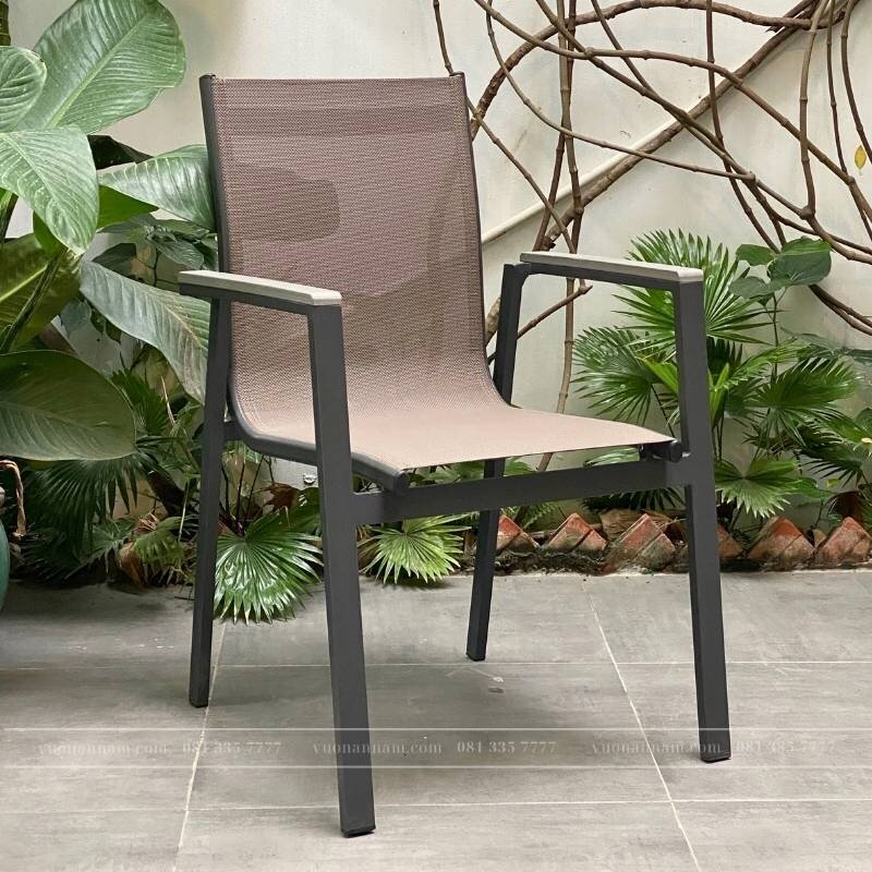 Ghế nhôm có dáng basic cùng những đường nét vuông vức, gọn ghẽ ở phần tựa lưng, mặt ngồi. Chiếc ghế nổi bật ở thiết kế tay vịn vững vàng, điểm tựa vững chắc cho bạn. Mặt lưới textilene bền bỉ sử dụng cho không gian ngoài trời, không bị hao mòn sau thời gian sử dụng.
