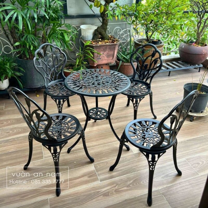 Bộ bàn ghế được chế tác từ nhôm đúc liền khối sử dụng công nghệ đúc khuôn áp lực cao, cho phép tạo ra những chi tiết sắc sảo và đồng nhất, hạn chế hoàn toàn tình trạng mối nối hay gỉ sét thường gặp ở vật liệu kim loại thông thường.