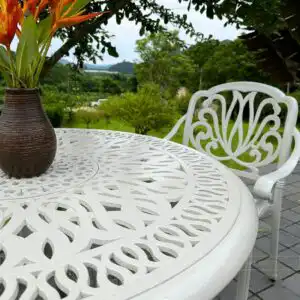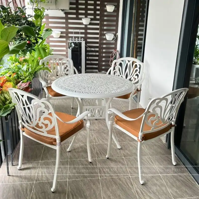 Được làm hoàn toàn từ hợp kim nhôm đúc, sản phẩm là lựa chọn hoàn hảo cho không gian ngoài trời. Nhôm đúc có độ bền vượt trội khác hẳn với gang, sắt, đồng,… Những bộ bàn ghế từ nhôm đúc thường có thời gian sử dụng lâu và giữ được vẻ đẹp lâu hơn những chất liệu khác.
