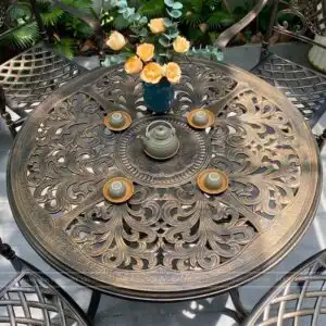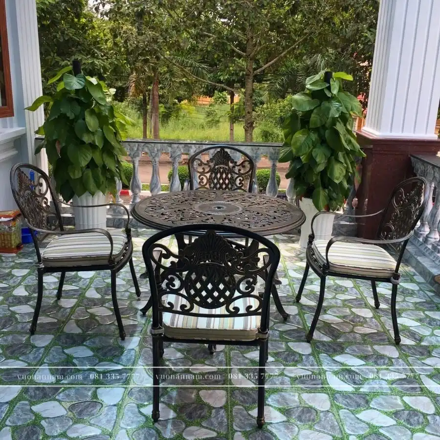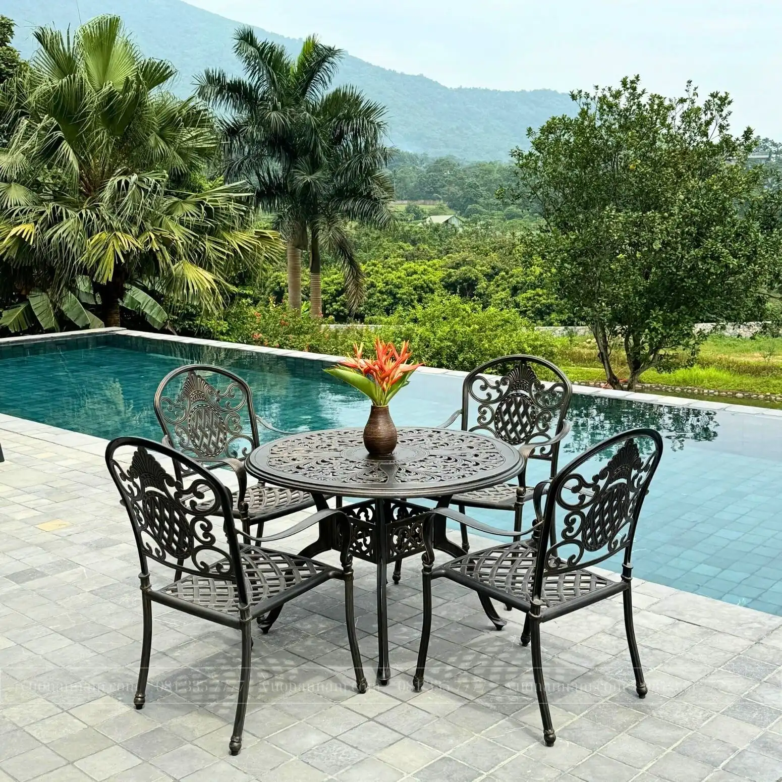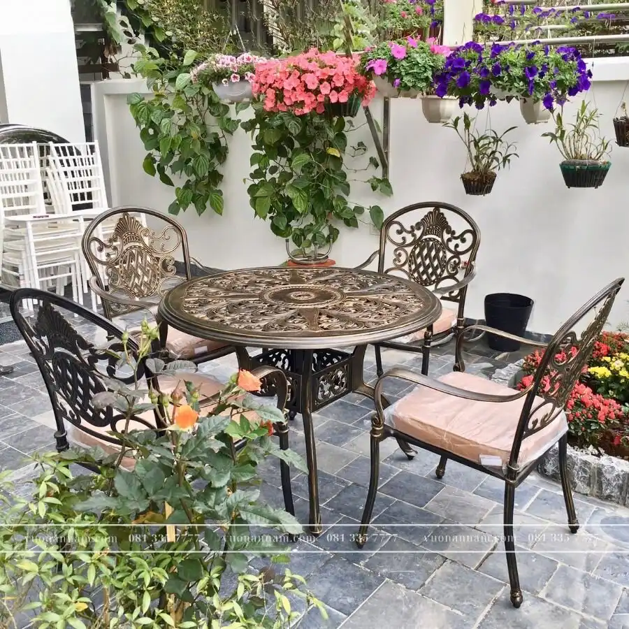 Bộ bàn ghế mang phong cách hoàng gia sang trọng, đây là gợi ý cho những gia chủ yêu thích sự cổ điển. Dù mang thiết kế cổ điển nhưng bộ bàn ghế lại không lỗi thời, mang đến nét đẹp riêng biệt cho không gian. Sở hữu kích thước rộng rãi cùng mặt bàn lên đến 1m, đây sẽ là lựa chọn ưu tiên cho sân vườn, sân thượng.