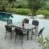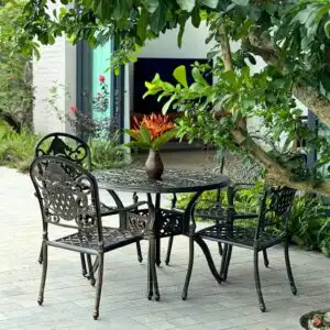 Bộ bàn ghế được làm từ chất liệu nhôm đúc sơn tĩnh điện cao cấp. Đây là chất liệu được nhiều người lựa chọn bởi độ bền và tính dẻo dai. Nhôm đúc mang độ bền vượt trội, hơn hẳn đồng, sắt, gang,… Ngoài ra, sản phẩm làm từ chất liệu này thường không bị hao mòn, gỉ sét hay oxi dưới tác động của thời tiết.