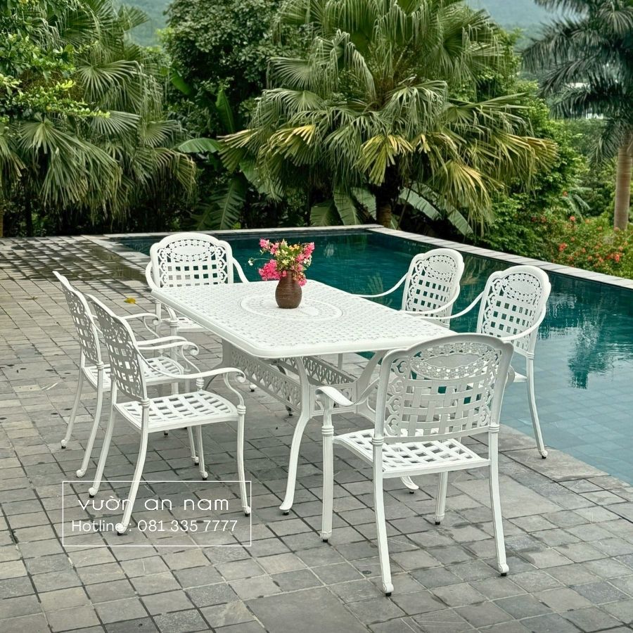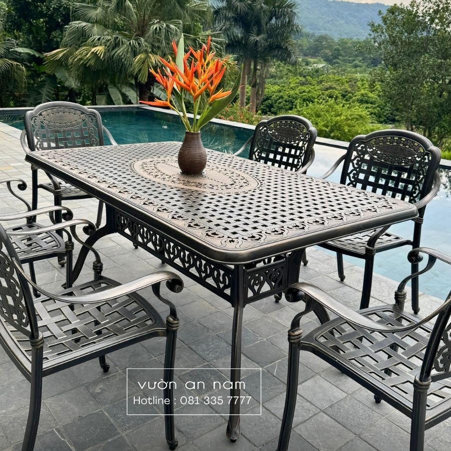 Sở hữu kích thước mặt bàn chữ nhật rộng rãi lên đến 1m8, phù hợp cho tiệc ngoài trời. Bộ bàn ghế là lựa chọn cho những không gian sân vườn, sân thượng, đó là điểm nhấn hoàn hảo cho không gian.