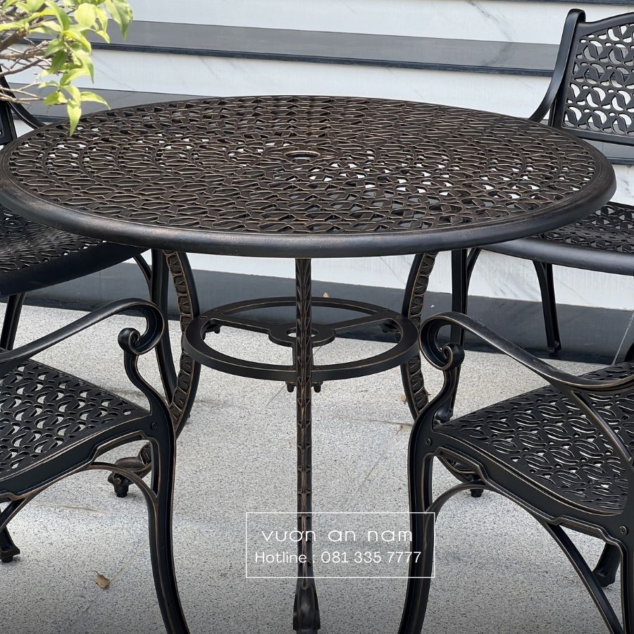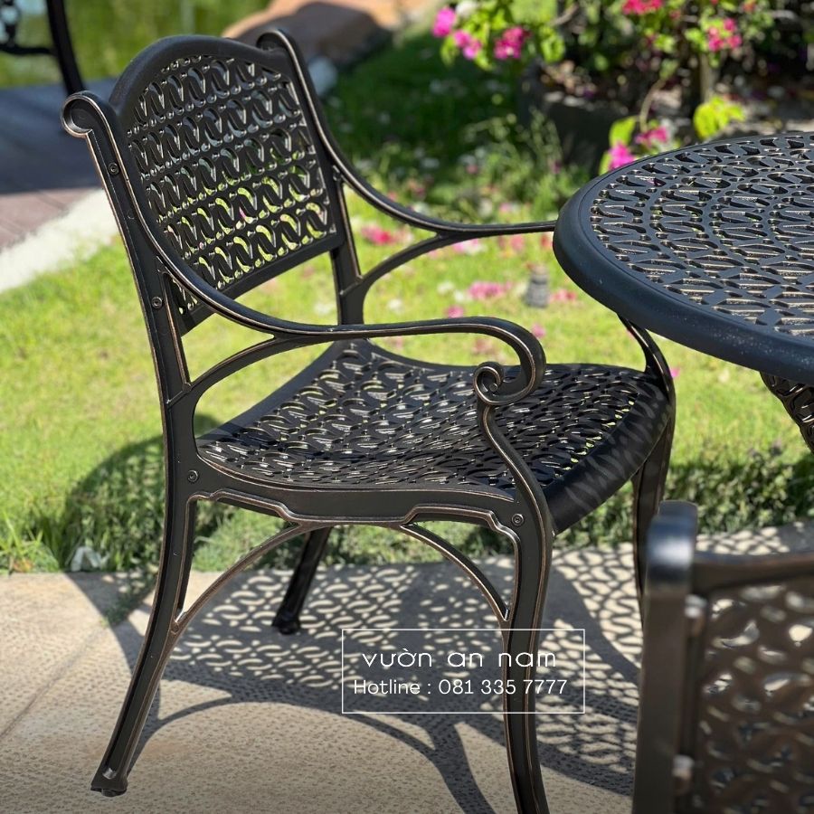 Được đồng điệu từ kiểu dáng đến màu sắc, hoa văn khắc họa tỉ mỉ giúp nổi bật không gian. Ngoài ra, chiếc ghế sở hữu kích thước mặt ngồi rộng rãi cùng tay vịn vững chắc, mặt ngồi cong nhẹ tạo cảm giác thoải mái cho người sử dụng. Mẫu bàn sân vườn có đường kính 100cm phù hợp cho những bữa ăn gia đình.