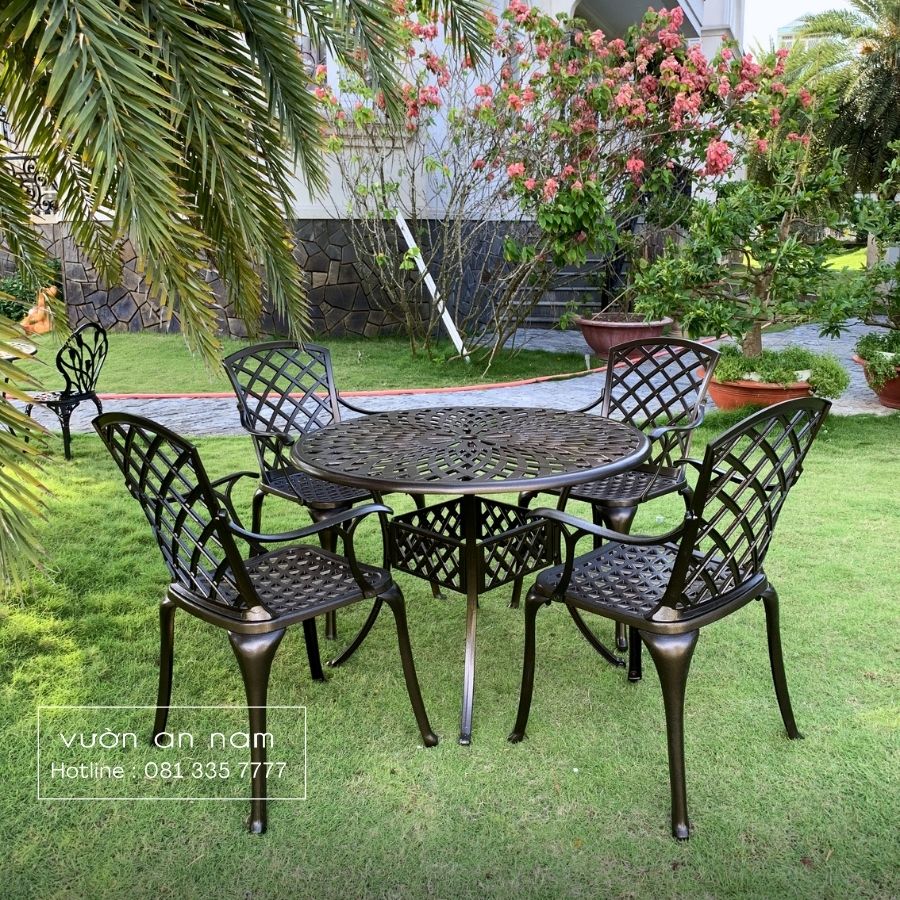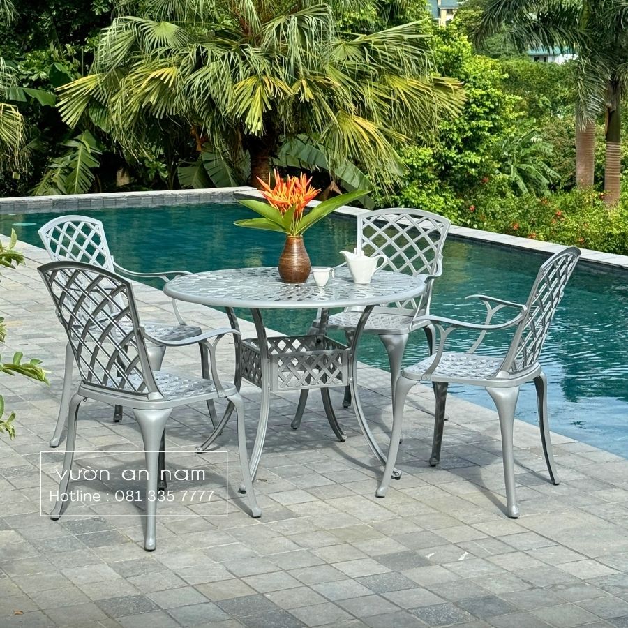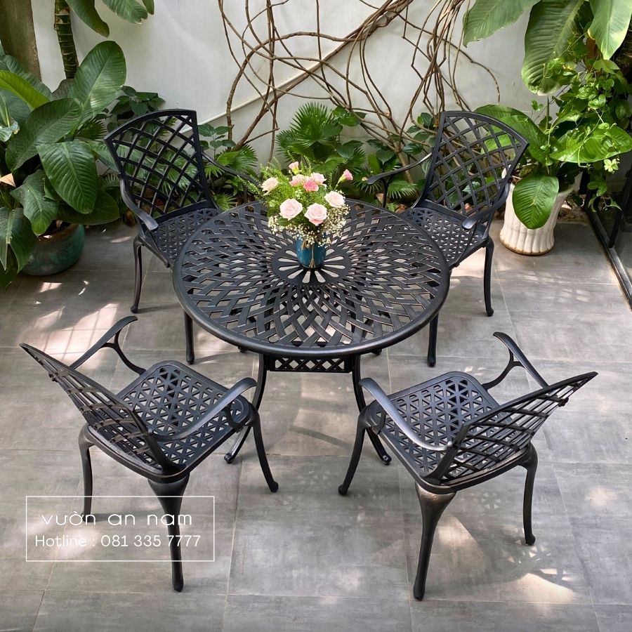 Không chỉ đẹp mắt, bộ bàn ghế này còn rất bền bỉ nhờ chất liệu nhôm đúc cao cấp. Chất liệu này không chỉ có khối lượng nhẹ mà còn có khả năng chống gỉ sét, chống tia UV, chịu được mọi điều kiện thời tiết khắc nghiệt.