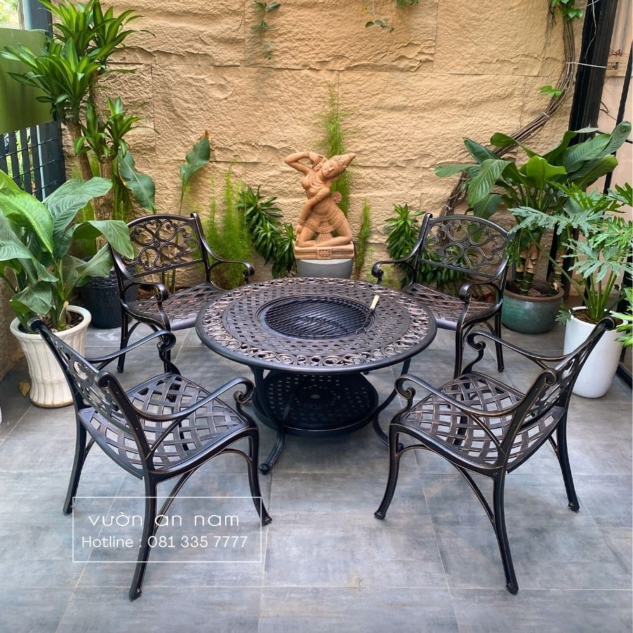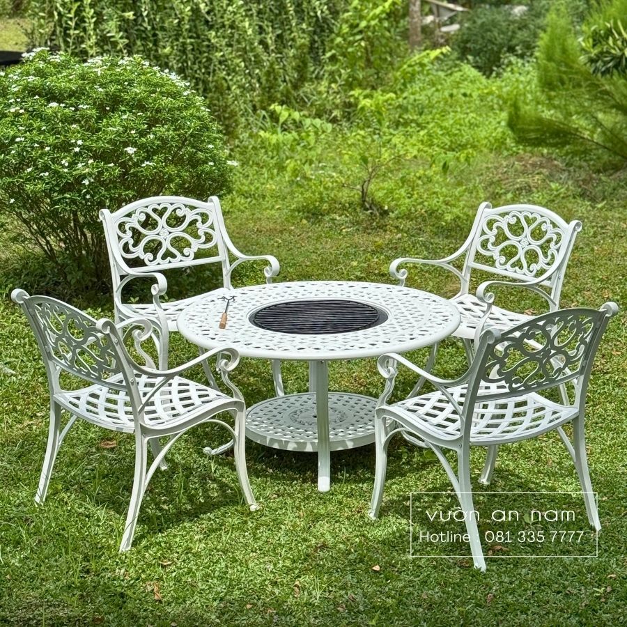 Điểm nhấn đặc biệt nhất của sản phẩm là bàn tròn tích hợp khu vực đặt bếp nướng BBQ ngay chính giữa. Thiết kế thông minh này giúp bạn dễ dàng tổ chức các buổi tiệc nướng ngoài trời, từ những buổi ăn nhẹ ấm cúng cho đến tiệc cuối tuần sôi động cùng bạn bè. Mặt bàn bao quanh vừa vặn để đặt món ăn, đĩa đựng, nước uống… tiện lợi và gọn gàng.