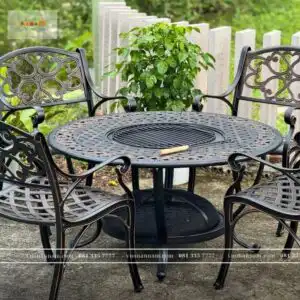Điểm nhấn đặc biệt nhất của sản phẩm là bàn tròn tích hợp khu vực đặt bếp nướng BBQ ngay chính giữa. Thiết kế thông minh này giúp bạn dễ dàng tổ chức các buổi tiệc nướng ngoài trời, từ những buổi ăn nhẹ ấm cúng cho đến tiệc cuối tuần sôi động cùng bạn bè. Mặt bàn bao quanh vừa vặn để đặt món ăn, đĩa đựng, nước uống… tiện lợi và gọn gàng.