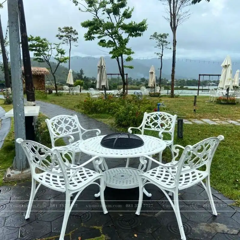 Ngoài ra, bộ bàn ghế còn được phủ lớp sơn tĩnh điện cao cấp để giúp màu sơn thêm bền màu, tránh trầy xước, va đập khi đặt tại không gian ngoài trời.