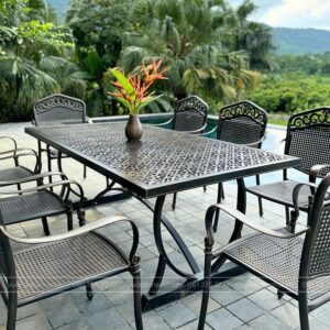 Nhôm đúc không chỉ nhẹ, dễ di chuyển mà còn bền bỉ, không bị ảnh hưởng bởi nhiệt độ, độ ẩm hay ánh nắng mặt trời. Đặc biệt, sơn tĩnh điện giúp tăng cường độ bền màu và giữ cho sản phẩm luôn sáng bóng, không bị phai màu theo thời gian.Phần mặt bàn được thiết kế với những họa tiết hoa văn độc đáo, tạo điểm nhấn cho không gian sân vườn. Các họa tiết được chăm chút kỹ lưỡng, mang đến vẻ đẹp cổ điển nhưng không kém phần hiện đại, phù hợp với nhiều phong cách trang trí ngoại thất.