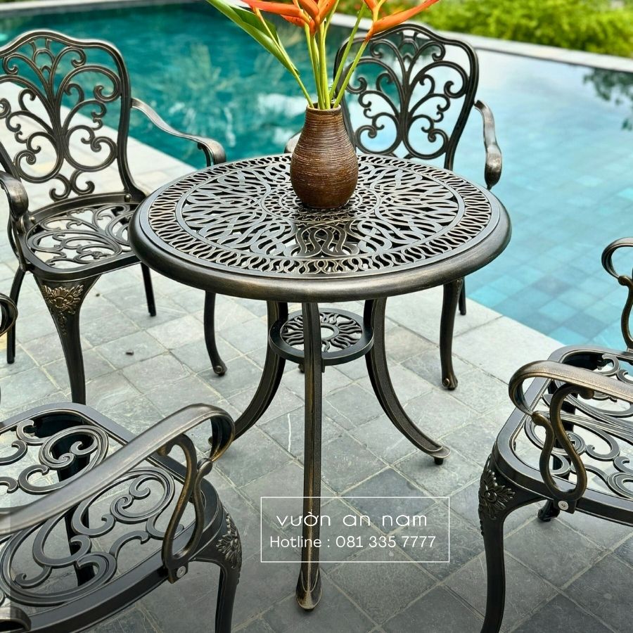 Bộ bàn ghế được làm từ chất liệu nhôm đúc cao cấp. Chất liệu này nổi bật bởi đặc tính mềm dẻo dễ dàng đúc thành nhiều họa tiết, vừa chịu lực tốt. Bản chất của hợp kim nhôm là chống oxy hóa giúp cho bàn ghế sân vườn BG-011 chống chịu mưa nắng rất tốt.