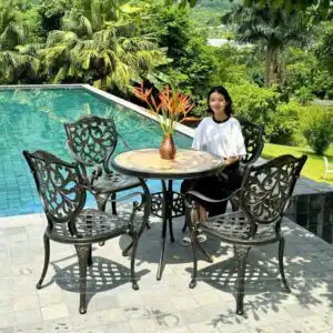 Bộ bàn ghế sân vườn không chỉ đơn thuần là những vật dụng ngoại thất, mà còn là biểu tượng của sự tinh tế và gu thẩm mỹ của gia chủ. Hình ảnh bộ bàn ghế với thiết kế hoa văn tinh xảo và chất liệu bền bỉ đã thể hiện rõ ràng sự độc đáo và sang trọng mà nó mang lại cho không gian sân vườn.